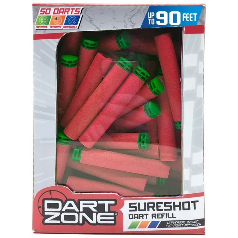 Stock up on the best performing darts with the 50 dart refill pack! Darts Fly up to 90 Feet!Need more foam darts? The Dart Zone 50 dart refill pack is ideally suited to replenish your stock. Darts are fully compatible with all Dart Zone brand blasters and the universal design makes them compatible with most standard blasters from other leading brands.Specifications