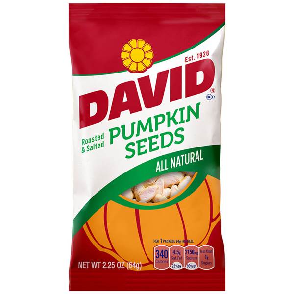 Grab a bag of DAVID Pumpkin Seeds for a satisfying snack. Packed with crunchy salty and delicious goodness, DAVID's pumpkin seeds have that dependable great taste you have always loved.Specifications