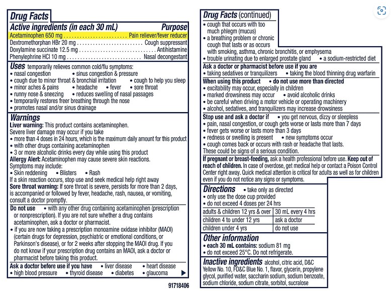 TEMPORARILY RELIEVES COMMON COLD/FLU SYMPTOMS: NASAL CONGESTION, SINUS CONGESTION & PRESSURE, COUGH DUE TO MINOR THROAT & BRONCHIAL IRRITATION, MINOR ACHES & PAINS, HEADACHE, FEVER, SORE THROAT, REDUCES SWELLING OF NASAL PASSAGES, TEMPORARILY RESTORES FREER BREATHING THROUGH THE NOSE, PROMOTES NASAL AND/OR SINUS DRAINAGE. HELPS LOOSEN PHLEGM (MUCUS) AND THIN BRONCHIAL SECRETIONS TO RID THE BRONCHIAL PASSAGEWAYS OF BOTHERSOME MUCUS AND MAKE COUGHS MORE PRODUCTIVE. ALCOHOL 10%. RECYCLABLE PACKAGING. HEADACHE, FEVER, SORE THROAT, MINOR ACHES AND PAINS. CHEST CONGESTION, THINS AND LOOSENS MUCUS. NASAL CONGESTION, SINUS PRESSURE. COUGH.Specifications
