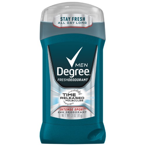 Degree Men Fresh Deodorant - Intense Sport 3 oz helps keep you fresh no matter what. Degree Men Intense Sport provides time released freshness with a dynamic scent containing an energizing hit of zesty lemon and bergamot orange with just a hint of manly musk. Whether youre having a long day in the office playing sport outdoors or working out in the gym with Degree Men Intense Sport you can be confident that youll be protected from body odor all day long. Degree Men Intense Sport Deodorant uses our classic formula with a fresh scent to give you long lasting odor protection. Designed by experts Degree deodorant contains active odor fighting ingredients and time released molecules that release fresh fragrance throughout the day. Degree Men Intense Sport is a mens deodorant stick that works as hard as you do and leaves no stains so you can remain confident and smell great when you need to most. For powerful long-lasting odor protection that keeps you smelling great all day long you can trust Degree. It comes in an easy to use 3 oz applicator stick. You simply turn the dial to raise the stick then apply a thin layer to your underarms and youre ready for anything. Stay confident and smell great with Degree Men Intense Sport Deodorant. Degree. It wont let you down.Specifications