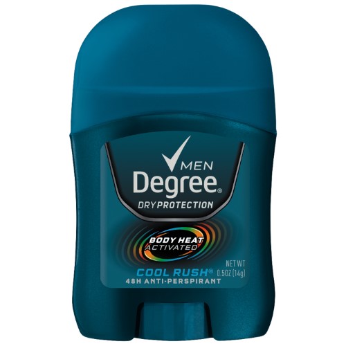 Body Heat Activated; Body responsive; Degree Men Original Protection Antiperspirant Deodorant - Cool Rush 0.5 oz provides 24-hour body odor and wetness protection that wont let you down; Goes on clear; Invisible solid - goes on clear; Powerful long-lasting sweat and odor protection; Reduces underarm wetness; Stay dry all day; Works well for outdoor sports and work outs