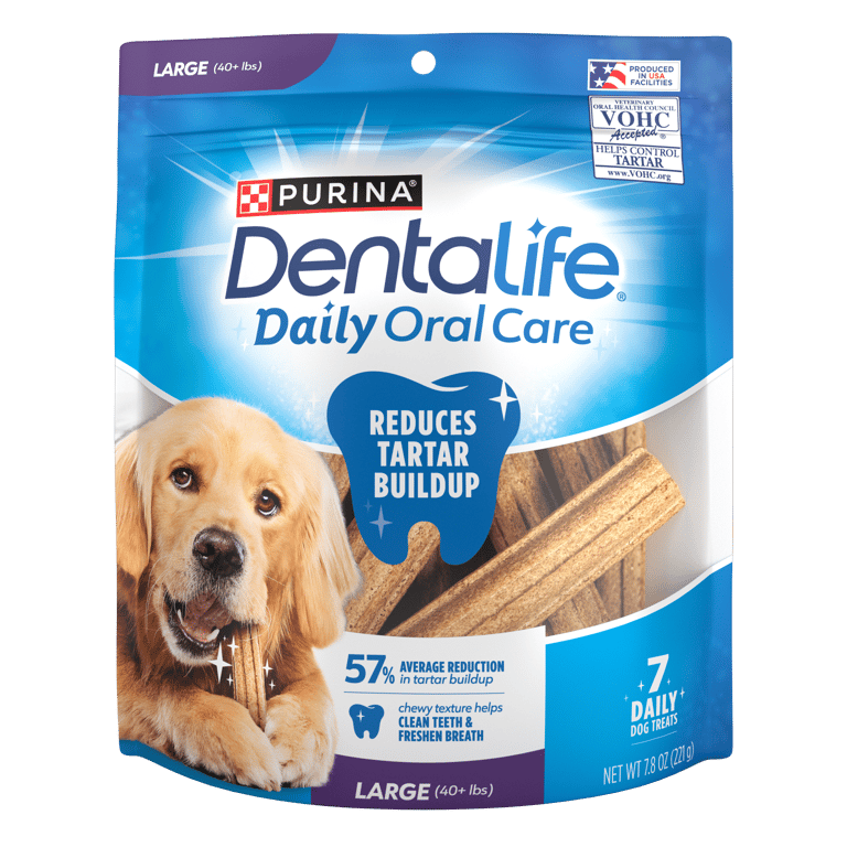 Part of caring for your dog's health is helping him to maintain healthy teeth, and Purina DentaLife Daily Oral Care large adult dog treats help clean his teeth. The tasty chicken flavor keeps him excited about snack time, while the wholesome ingredients let you feel good about serving these treats to your dog. With a formula that's scientifically tested to reduce tartar buildup, these VOHC (Veterinary Oral Health Council) accepted treats help to deliver a breakthrough clean that's sure to keep you both smiling. The innovative design, which contains eight distinct ridges plus thousands of air pockets that produce a porous, chewy texture, cleans his teeth right down to the gumline.Specifications