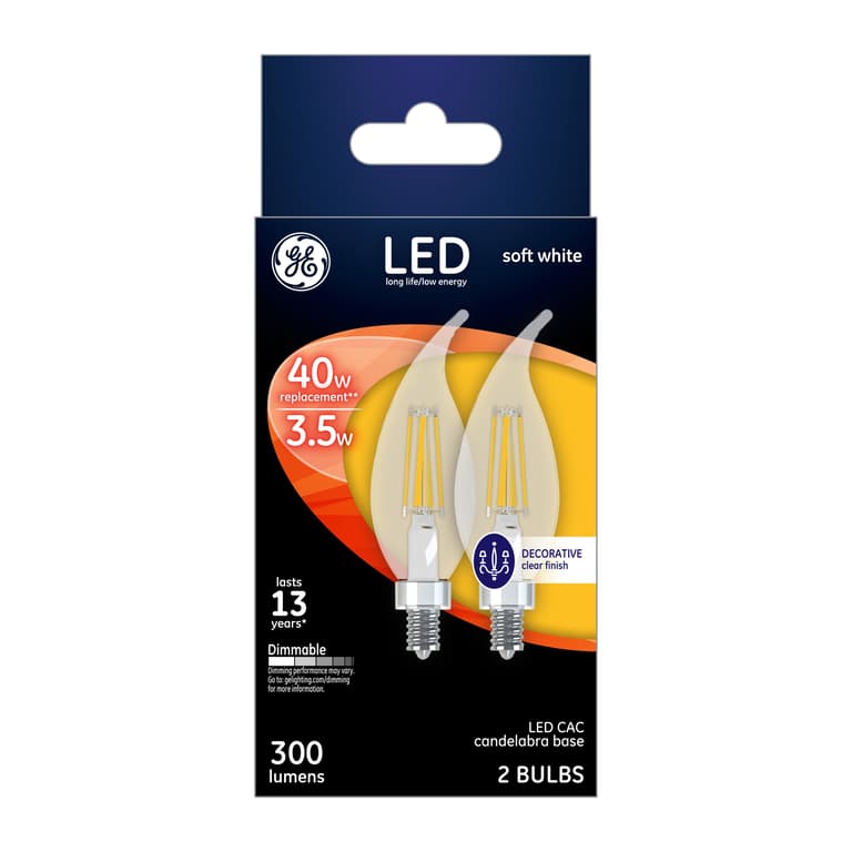GE’s Soft White LED 40-Watt Replacement Clear Deco light bulb offers outstanding energy efficiency, long-lasting performance and just-right brightness, all in one package. It’s dimmable and illuminates your home with soft, warm light. Use this candelabra-base GE LED decorative bulb in indoor chandeliers, sconces and fixtures where the bulb is visible. Thanks to its aesthetic design, GE’s Soft White LED 40-Watt Replacement Clear Deco light bulb compliments your fixture and adds a decorative touch even when the light is off. When it’s turned on, its long life and low energy use will help you save money on energy.Specifications