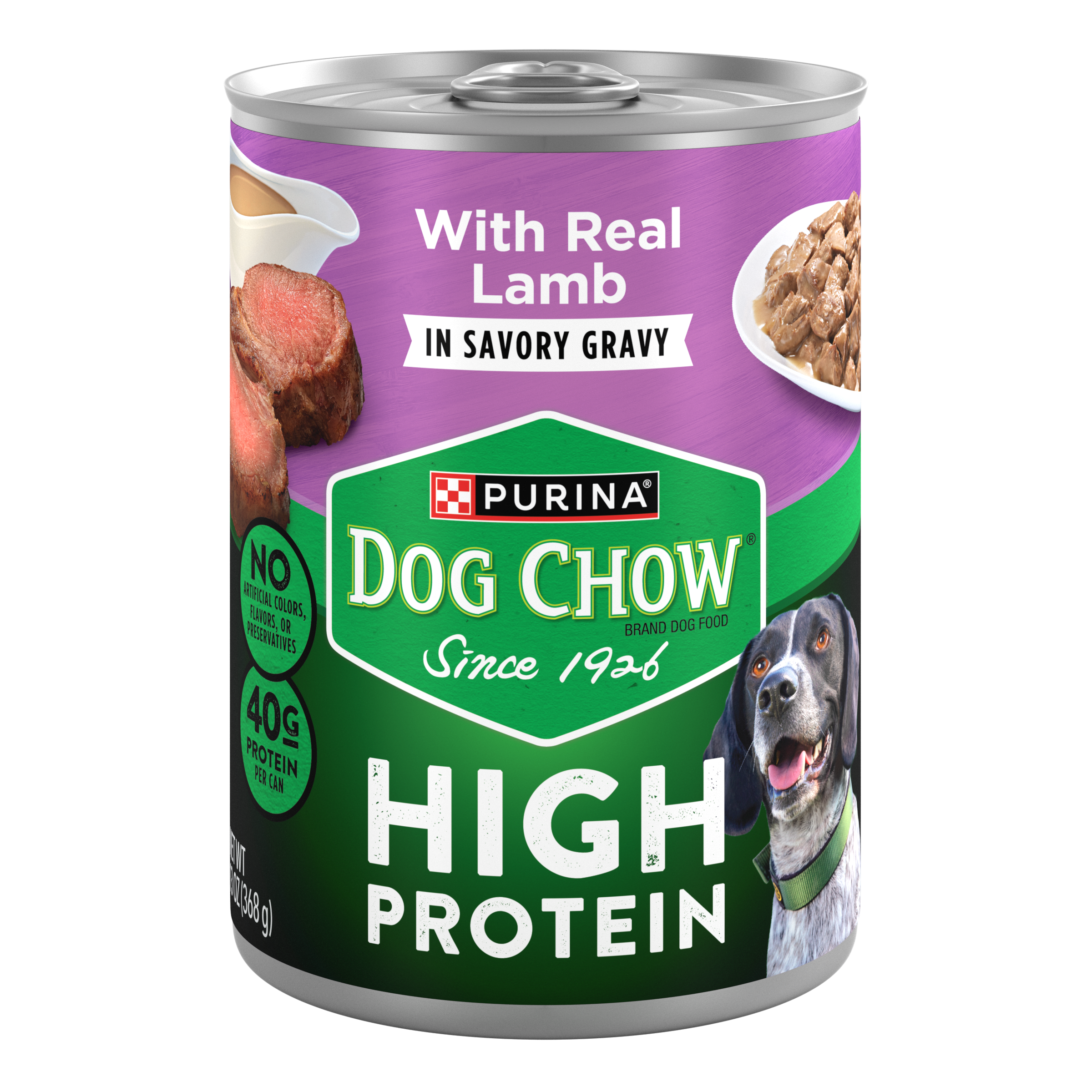Dog food in gravy made with real lamb; Purina Dog Chow dog food with high protein (40g of protein per can); Wet canned dog food with no artificial colors, flavors or preservatives; Wet dog food that’s 100 percent complete and balanced for adult dogs