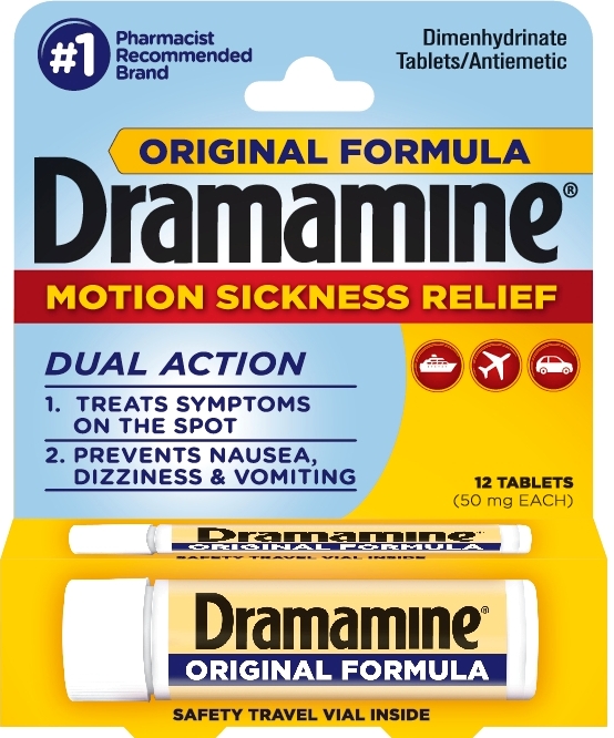 Motion Sickness Relief, For Children and Adults, Original Formula, Tablets 12 tablets Dimenhydrinate tablets/antiemetic. 50 mg each. Easy open travel package! Fast acting. Made in Canada. For prevention and treatment of these symptoms associated with motion sickness: nausea, vomiting, dizziness.Specifications