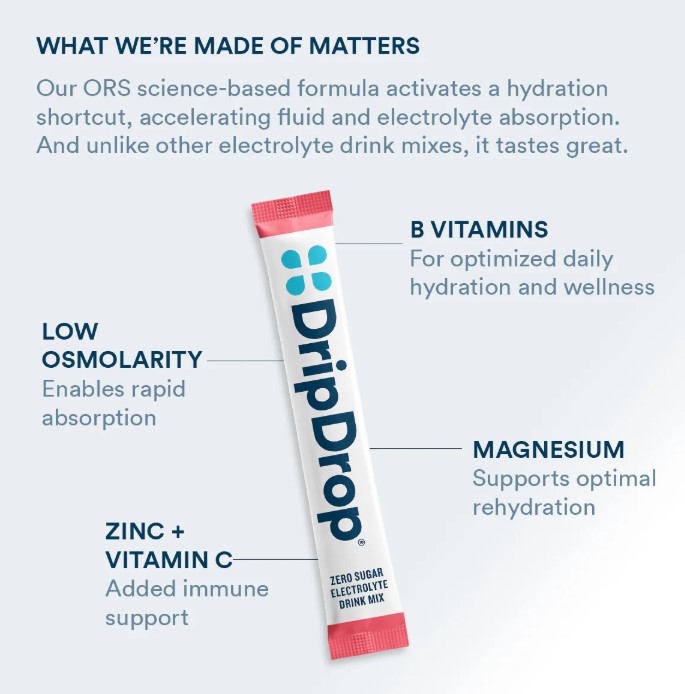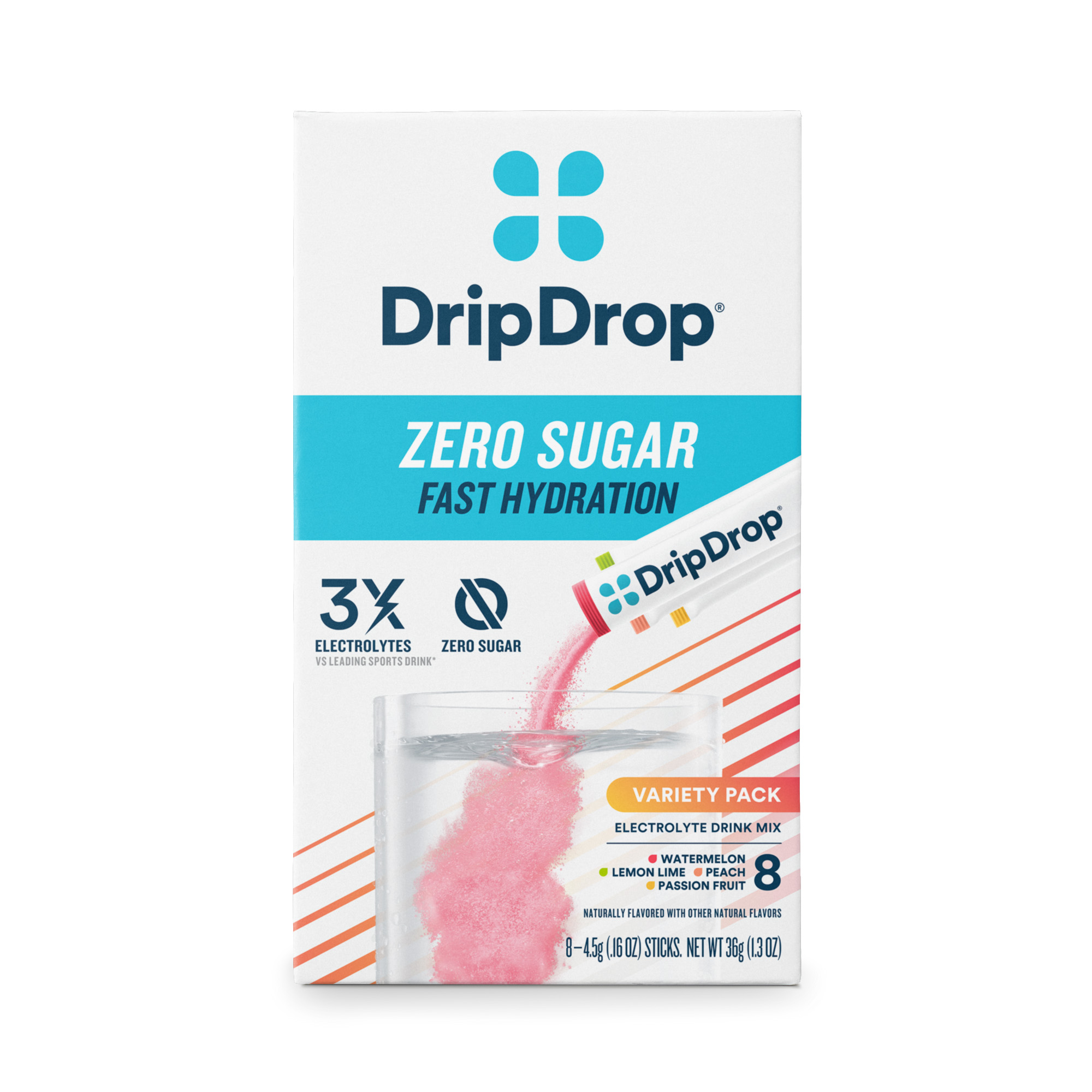 Our top sellers in a delicious sugar-free 4 flavor variety pack: Lemon Lime, Watermelon, Passion Fruit, and Peach assortment.DripDrop contains the sodium electrolyte levels and lower glucose content required to facilitate fast fluid absorption, AND it tastes great. Packed with essential electrolytes like sodium, potassium, and magnesium, plus zinc and vitamin C for immune support, it's an effective rehydration solution.Developed by Dr. Eduardo Dolhun - an expert in oral rehydration therapy - during his humanitarian aid missions. DripDrop was created by him as a Public Benefit Corporation on a mission to defeat dehydration at home and abroad. Every DripDrop purchase generates donations to those who need it most. DripDrop is the fast-acting, delicious-tasting dehydration remedy trusted by doctors, firefighters, elite athletes and the U.S. Military.Specifications