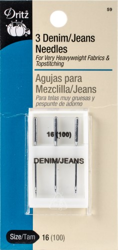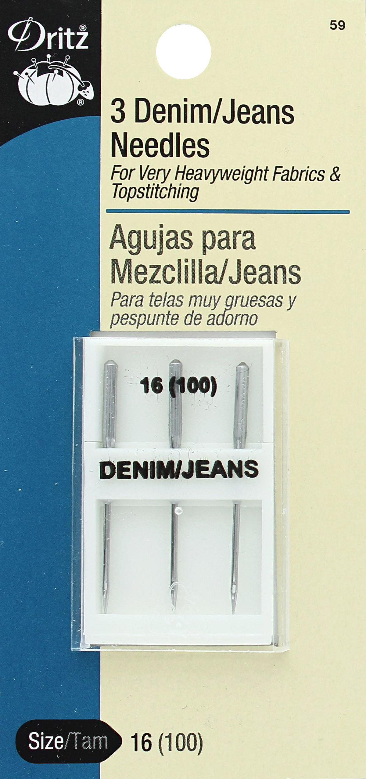 Dritz 3 Denim/Jeans Needles - Size 16 Designed to be used for very heavyweight fabrics, denim, canvas and topstitching. These needles have a thick, strong shaft with a sharp point to ensure they penetrate your fabric. Use with polyester or cotton-wrapped polyester thread.Specifications