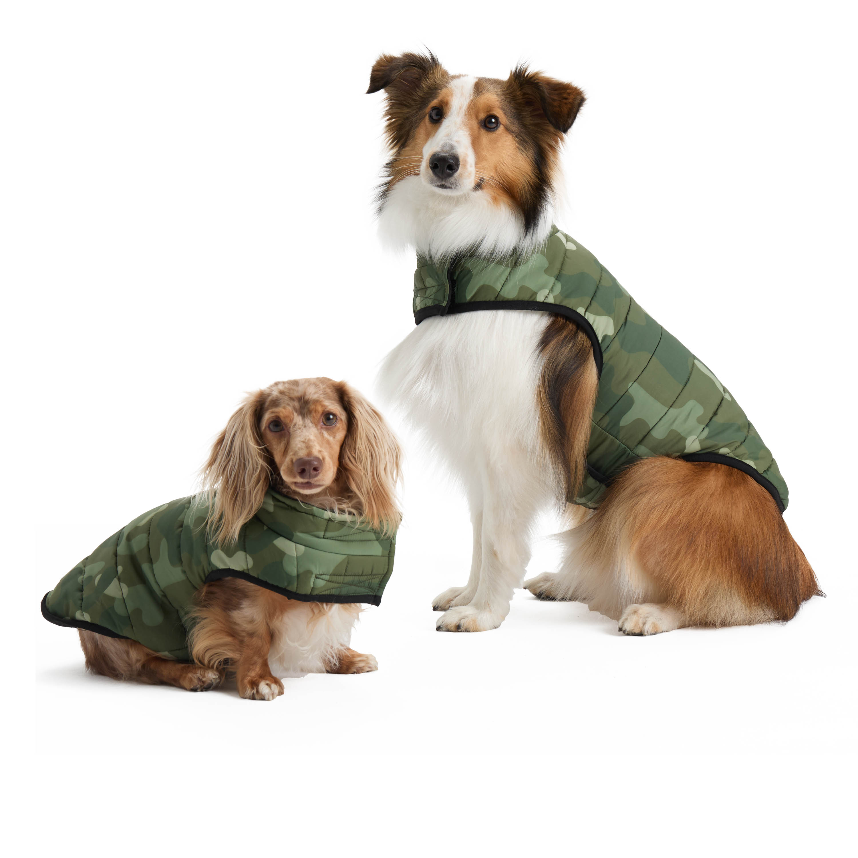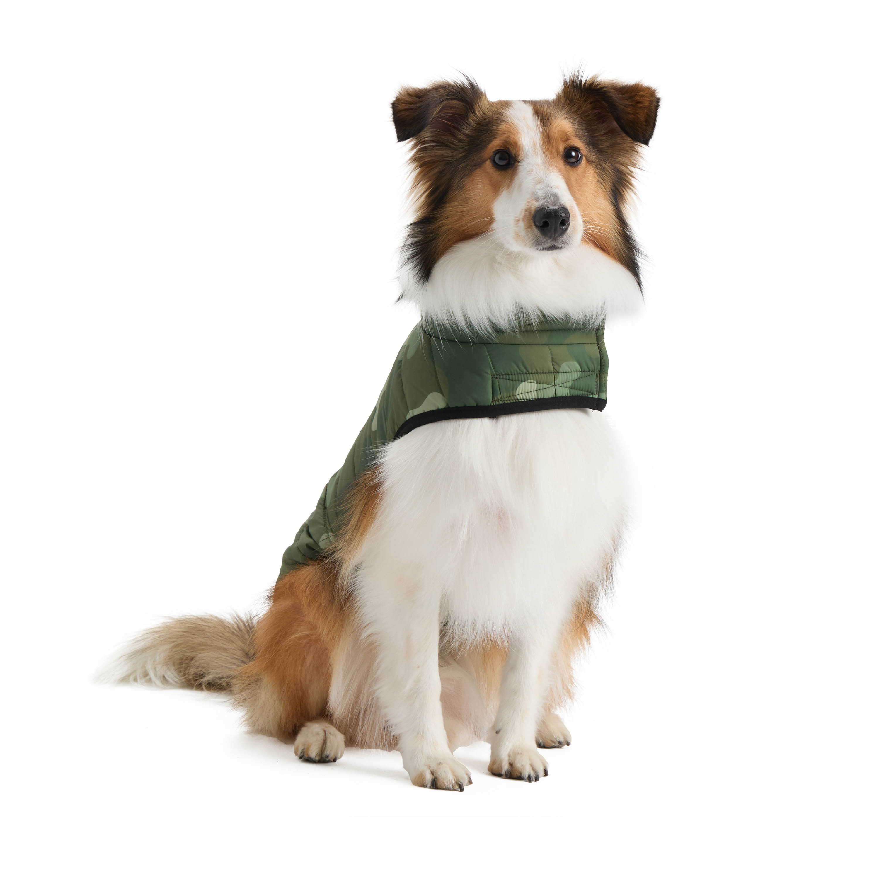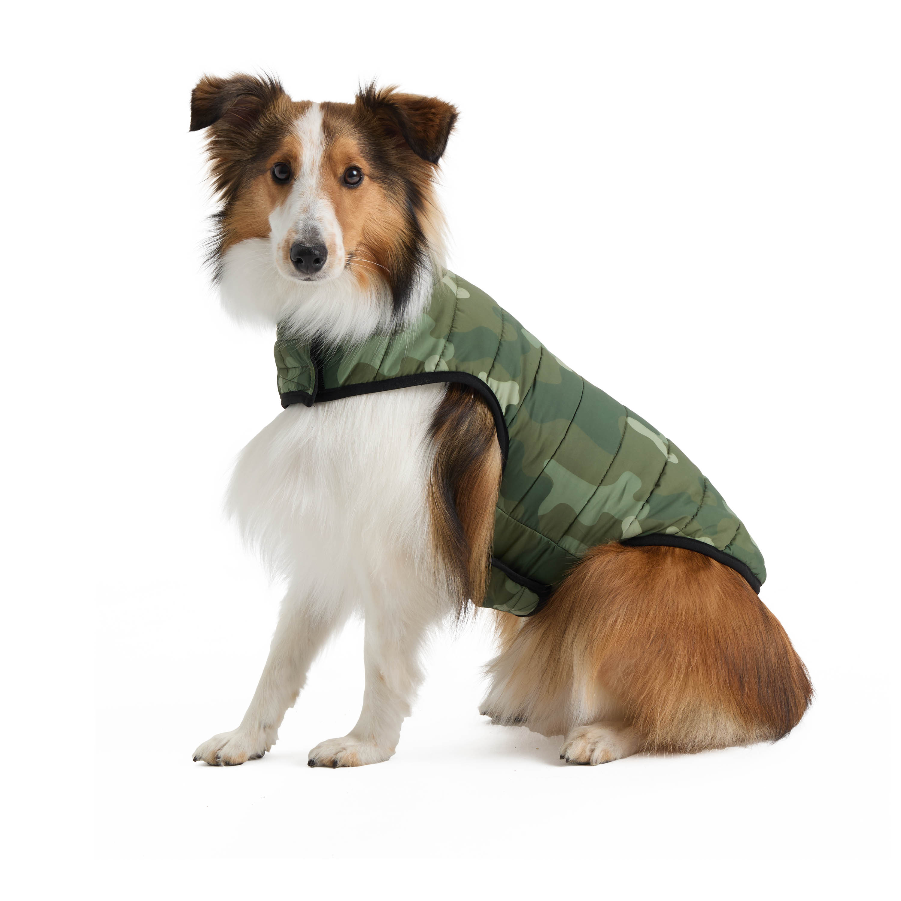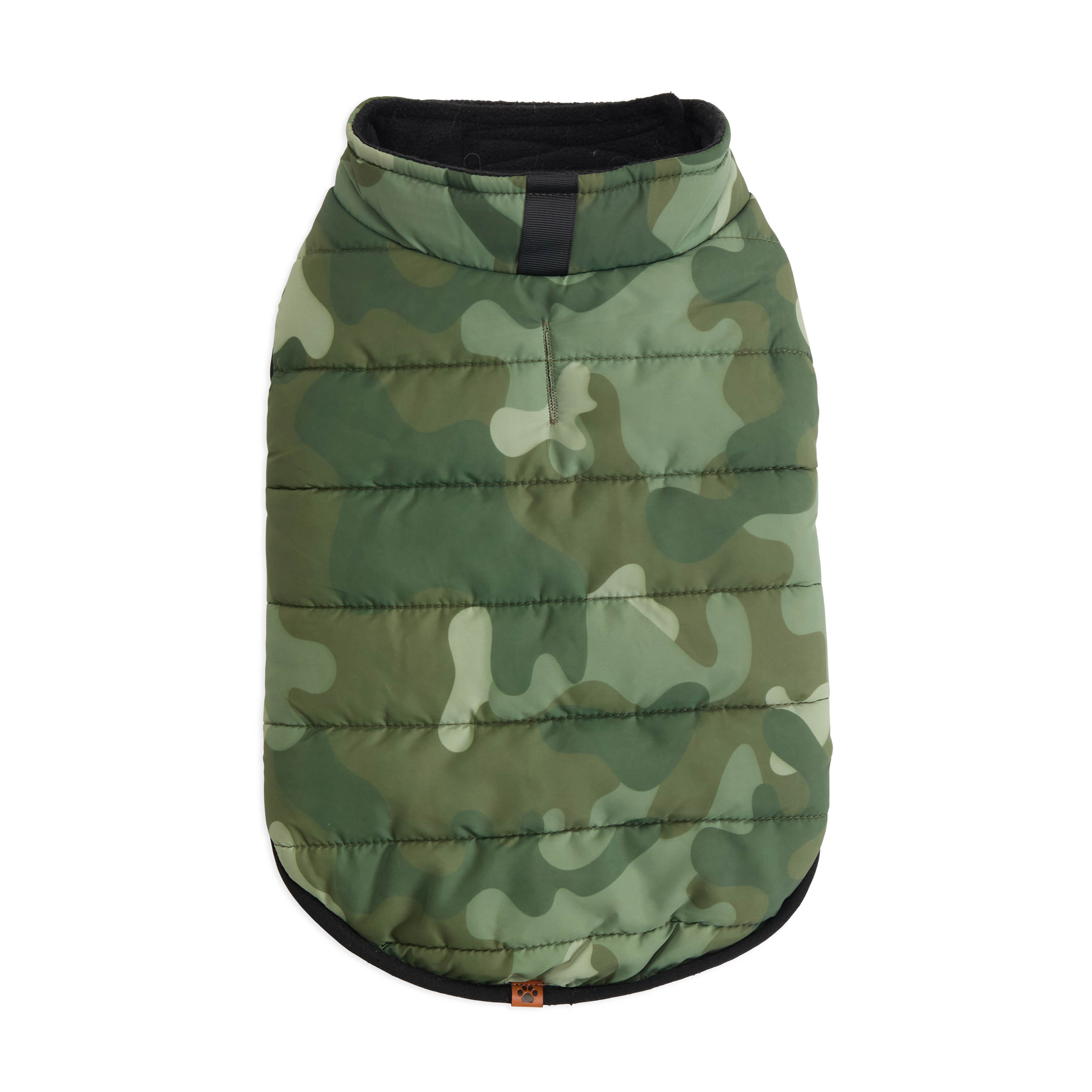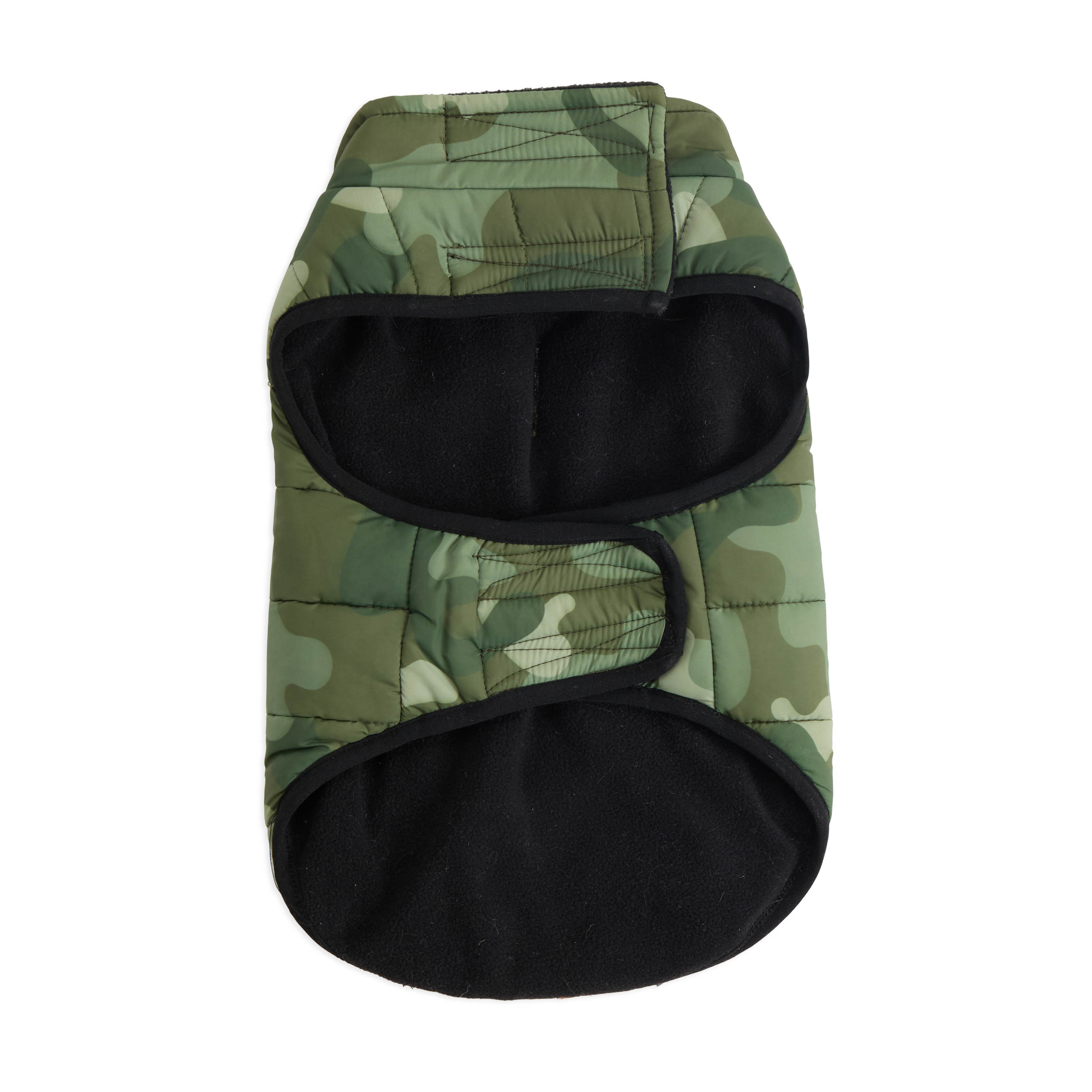 Camouflage puffer jacket; Easy-to-adjust Velcro closures at the neck and belly for a perfect fit; Leash keyhole; Polar fleece lining; Polyester shell and filling