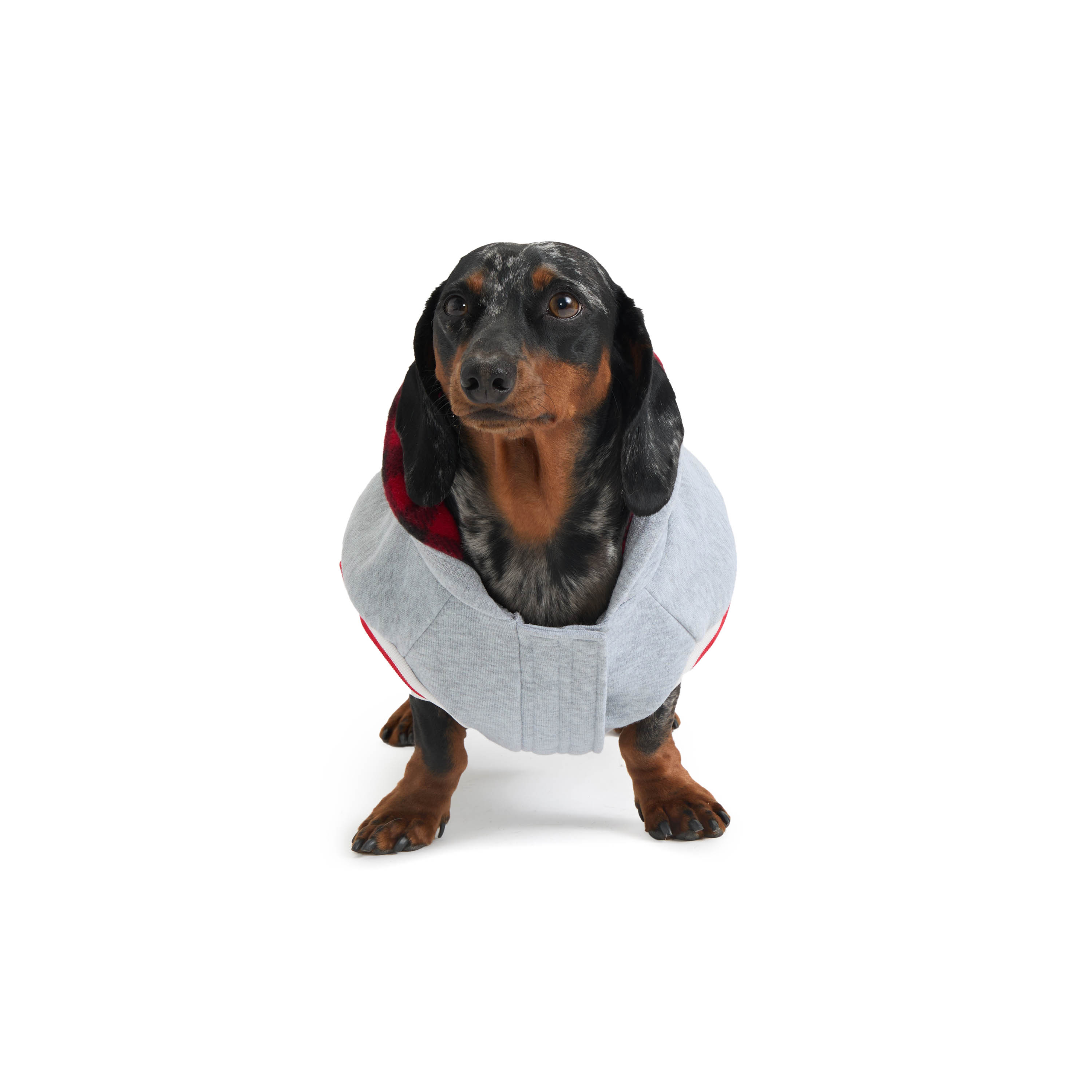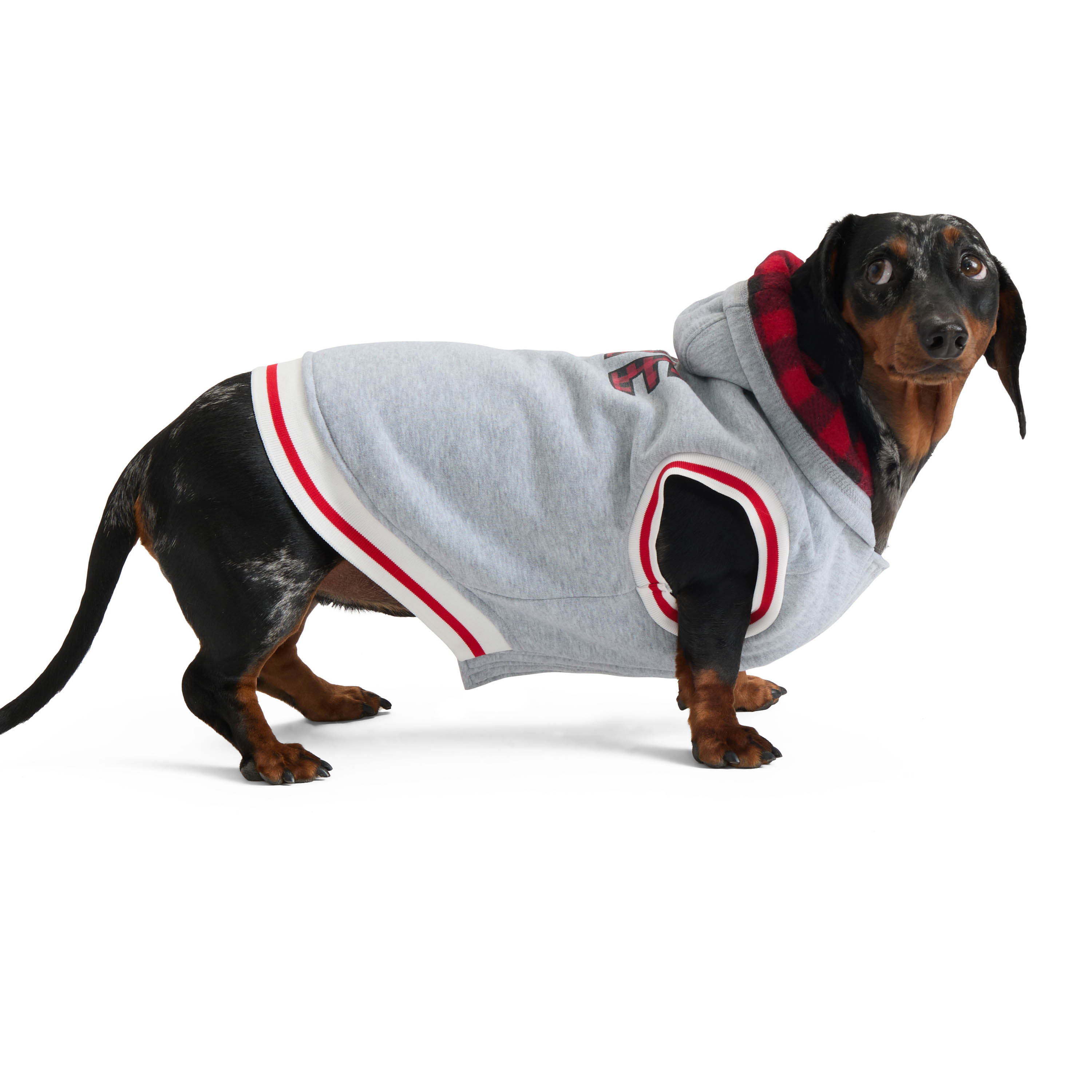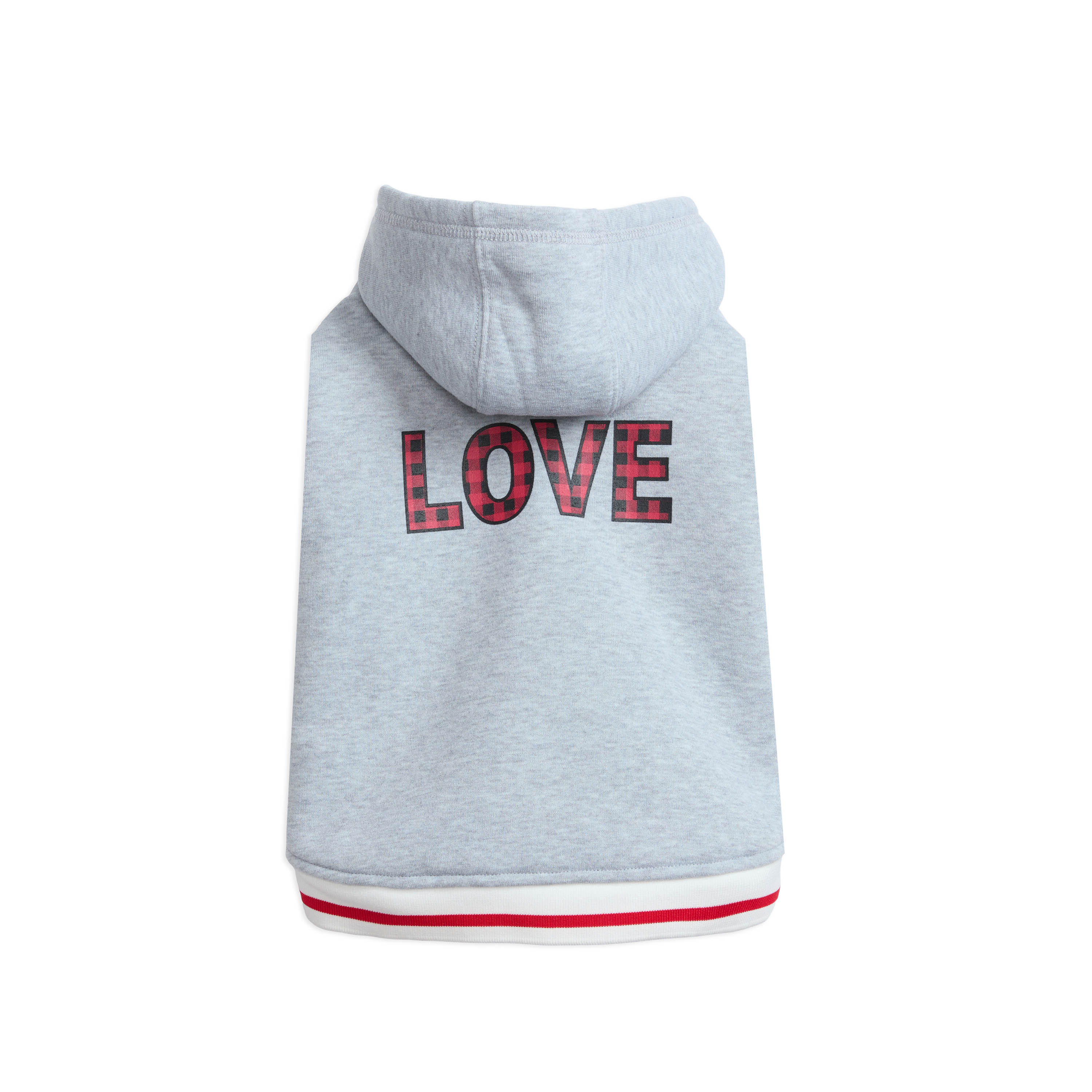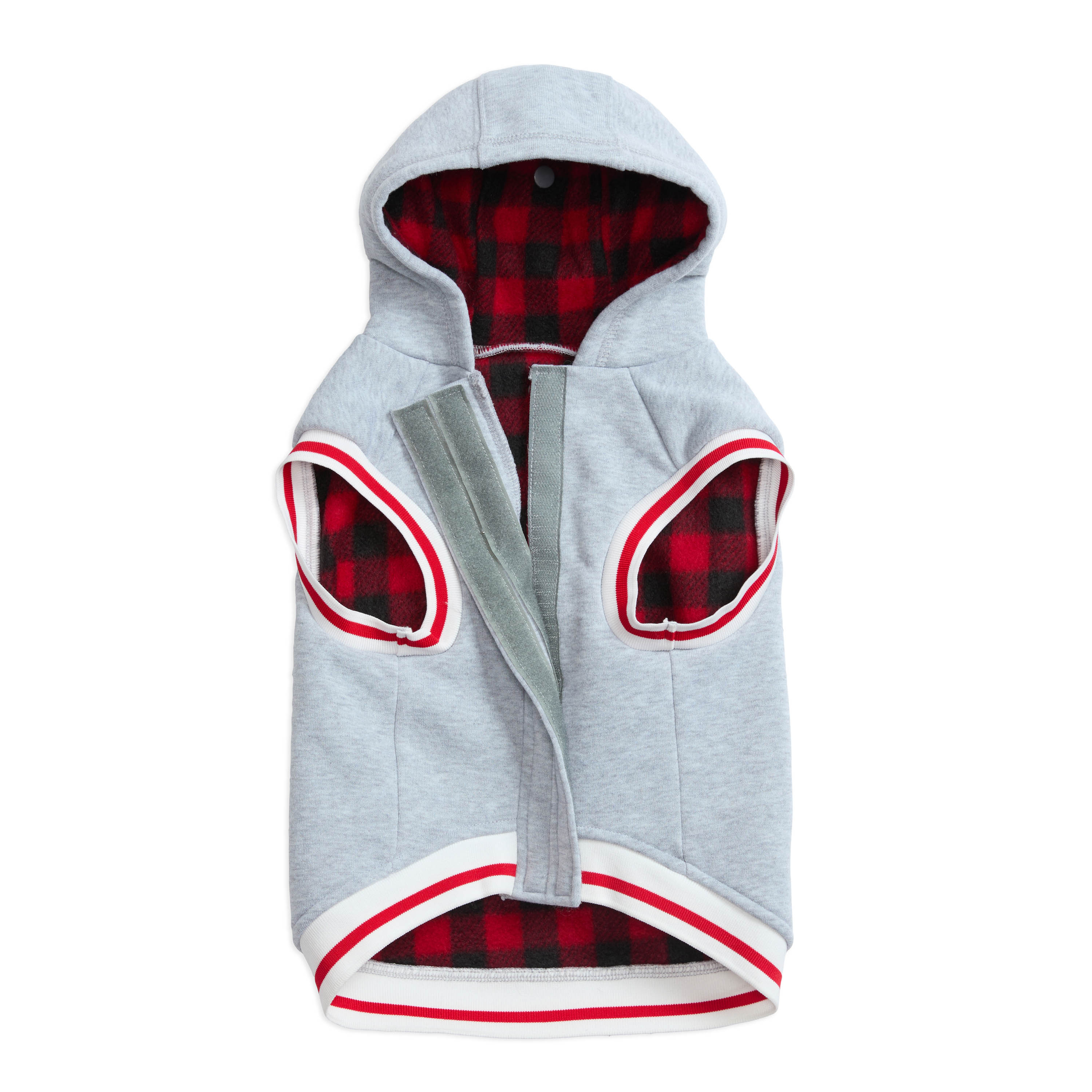 Wrap your pup in ultimate comfort with this cozy plaid-lined hooded fleece. Featuring a soft microfleece lining for warmth, this hoodie is designed for both comfort and style. The contrast striped rib at the hem and cuffs adds a stylish touch, while the Velcro front closure ensures a secure fit. The hood conveniently snaps into place when not in use, and the adorable "Love" puff and flat print at the back adds the perfect finishing touch. Plus, the practical leash keyhole makes it easy to take your pup on walks in style. Ideal for chic comfort all season long!Specifications