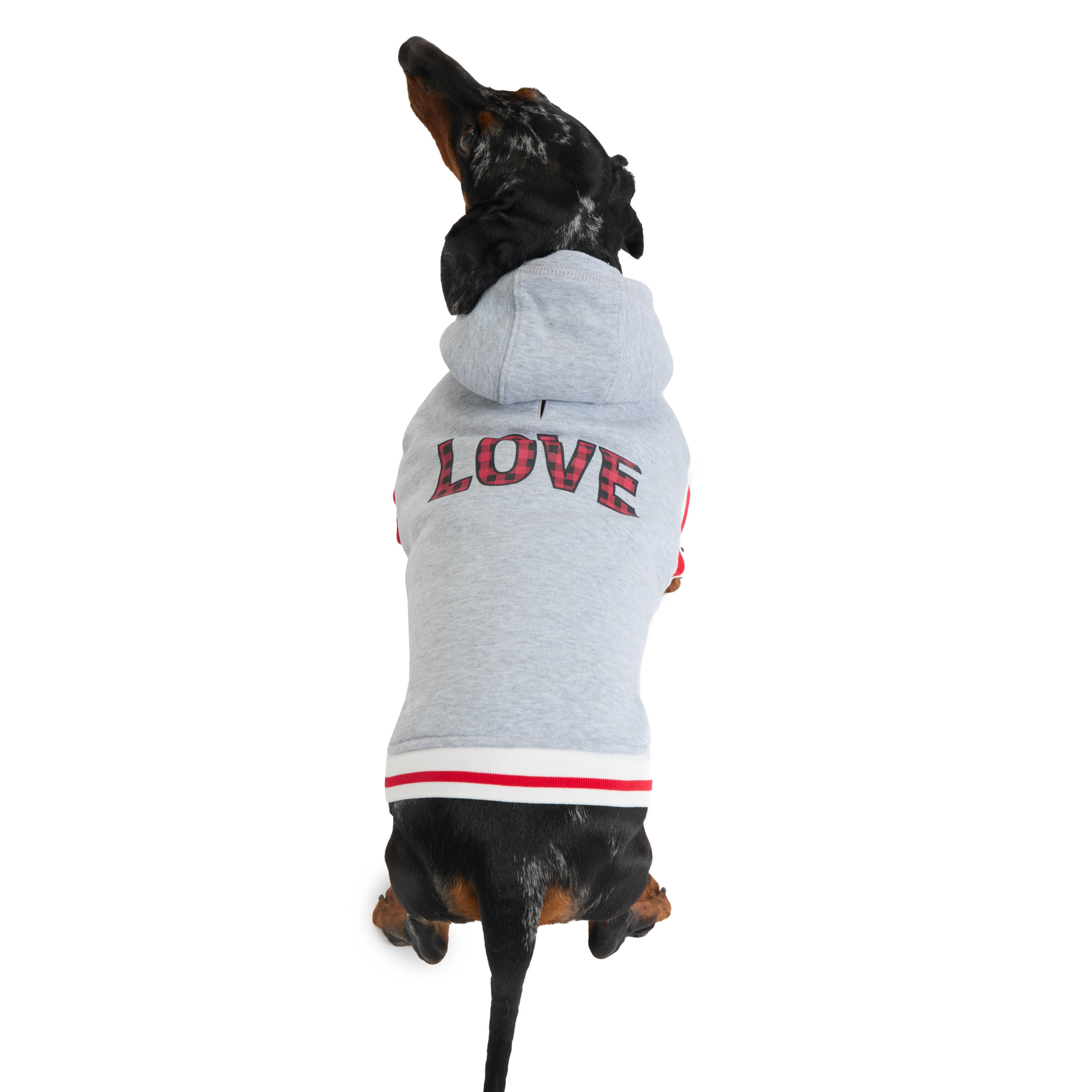DUKE & DAISY PLAID-LINED FLEECE DOG HOODIE W/ 'LOVE' PUFF PRINT