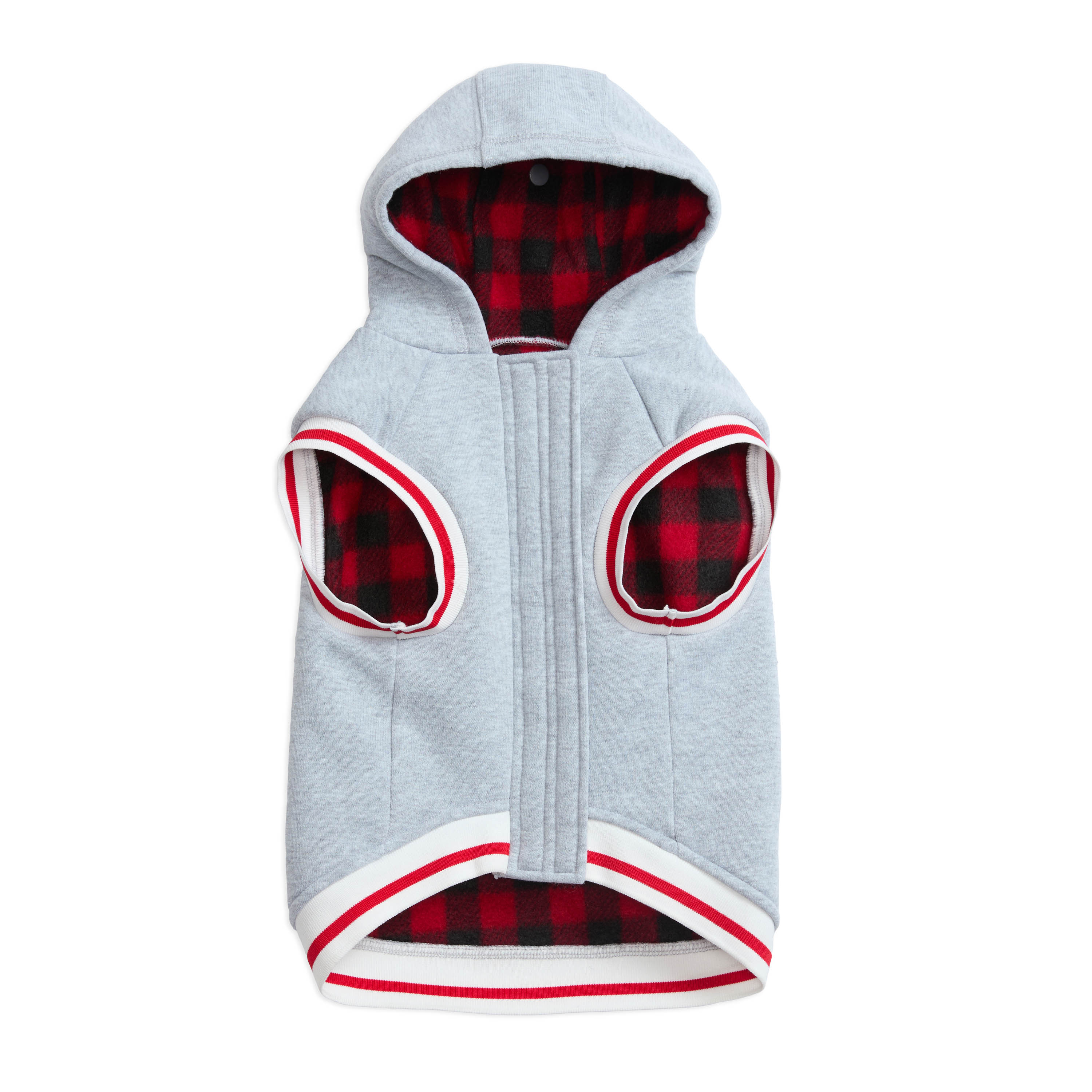"Love" puff and flat print at back; Contrast striped rib at hem and cuffs; Leash Keyhole; Lined with soft plaid microfleece; Plaid-lined hooded fleece; Snap closure to securely hold the hood when not in use; Velcro front closure for a customizable and secure fit