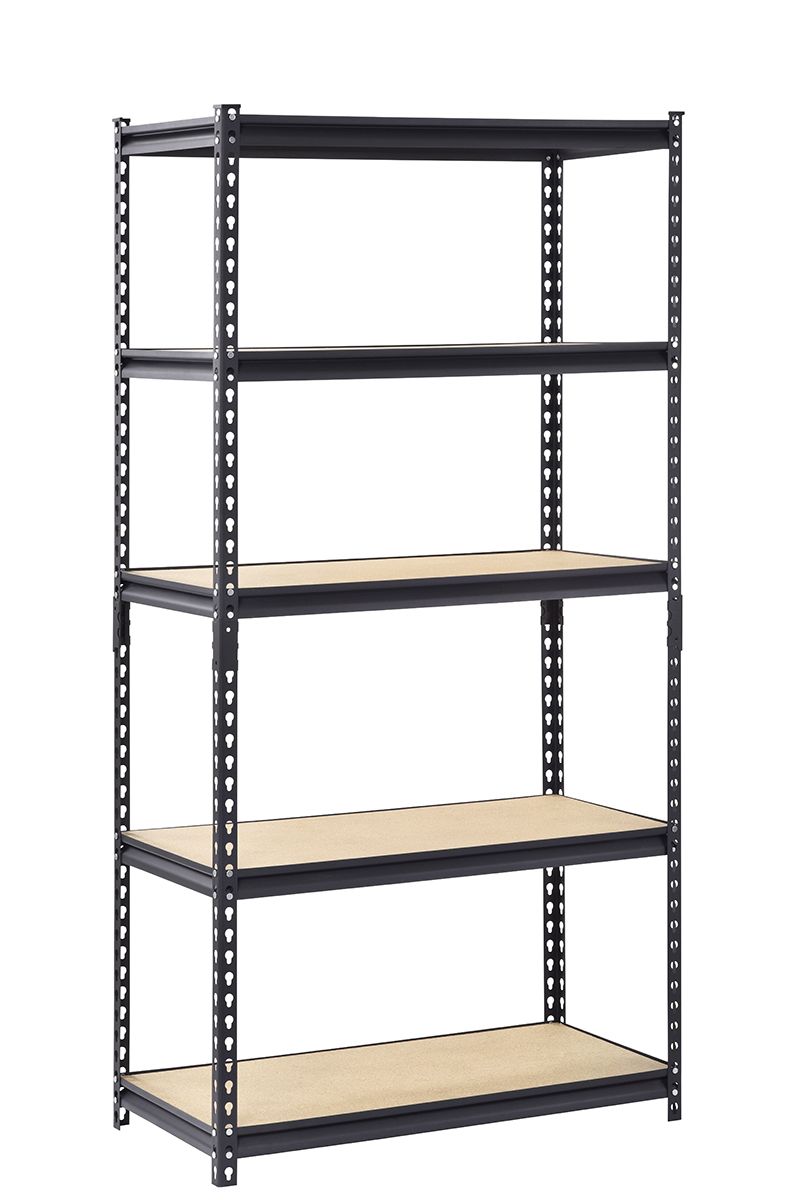 5 shelves that provide ample storage for bins boxes tools food containers and more; Each shelf supports up to 800 lbs.; Enamel finish protects against corrosion and chipping; Steel beams and shelves with particle boards and a durable black enamel finish; Total weight capacity of 4000 lbs.; Versatile design can be assembled as shelving unit or work bench