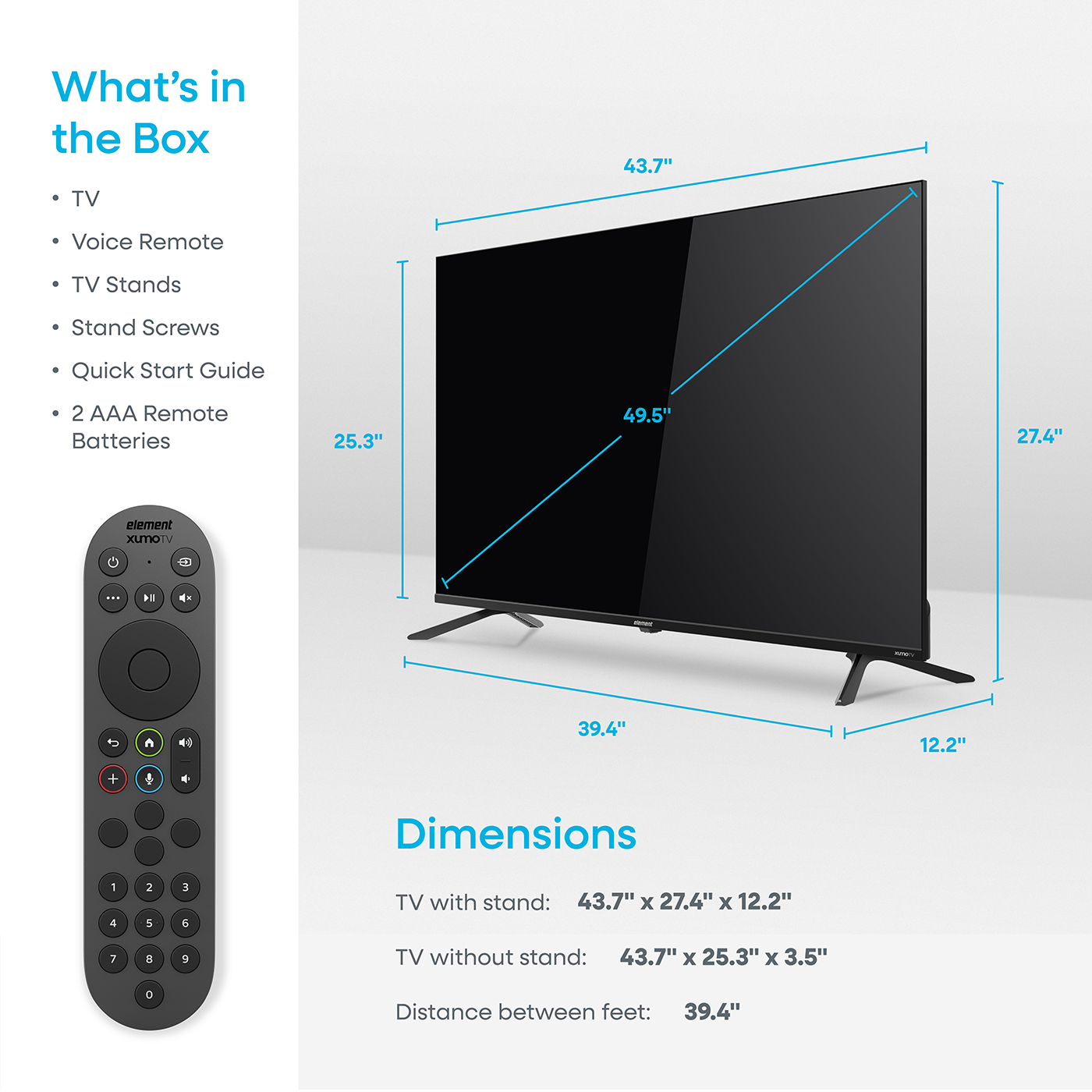 Experience breathtaking picture quality with Element's 50 inch Xumo TV. With its 4K Ultra HD resolution, you'll enjoy a stunningly clear and detailed image that brings your favorite movies, TV shows, and video games to life. Plus, Dolby Vision and HDR technology provide enhanced color and contrast for an even more immersive viewing experience even in the darkest of scenes. Dolby Audio delivers superior sound for immersive movie watching and gaming. And with a 120Hz effective refresh rate, you'll never miss a moment of the action, even during fast scenes. Enjoy smoother motion and sharp visuals while playing video games or watching fast-moving shows and movies. Stream, control, and share content like videos, music, and more to your Element Xumo TV using Apple AirPlay. Plus, this 50" television works with Apple Home for all your smart home needs. The built-in smart Xumo TV platform gives you all the perks without all the unnecessary cables. A straightforward home screen and advanced Xumo TV voice remote make navigating your television easy for anyone in your household. Best of all, the home screen lists your recent apps, channels, inputs, and more, so you can get back to streaming. Smart recommendations take the hassle out of deciding what to watch. Stream what you love on this 50 in TV with sports, news, music, kids and family, food, science and tech, fitness, foreign language, and so much more. Wi-Fi connectivity makes accessing the best content quick and easy. And with Bluetooth built in, you can easily pair your television with compatible Bluetooth devices, such as speakers, headphones, game controllers, laptops, and more. Use the voice remote for universal search across all your apps to quickly find what you’re looking for. You can even switch between apps, discover new shows, change the volume, and more with the sound of your voice. Customize your home screen with My List a curated list of your favorite shows and movies all in one place. Simply add titles to My List, and the Xumo TV OS will pull from all the apps you use to make it easy to continue watching. Bring it home.Specifications