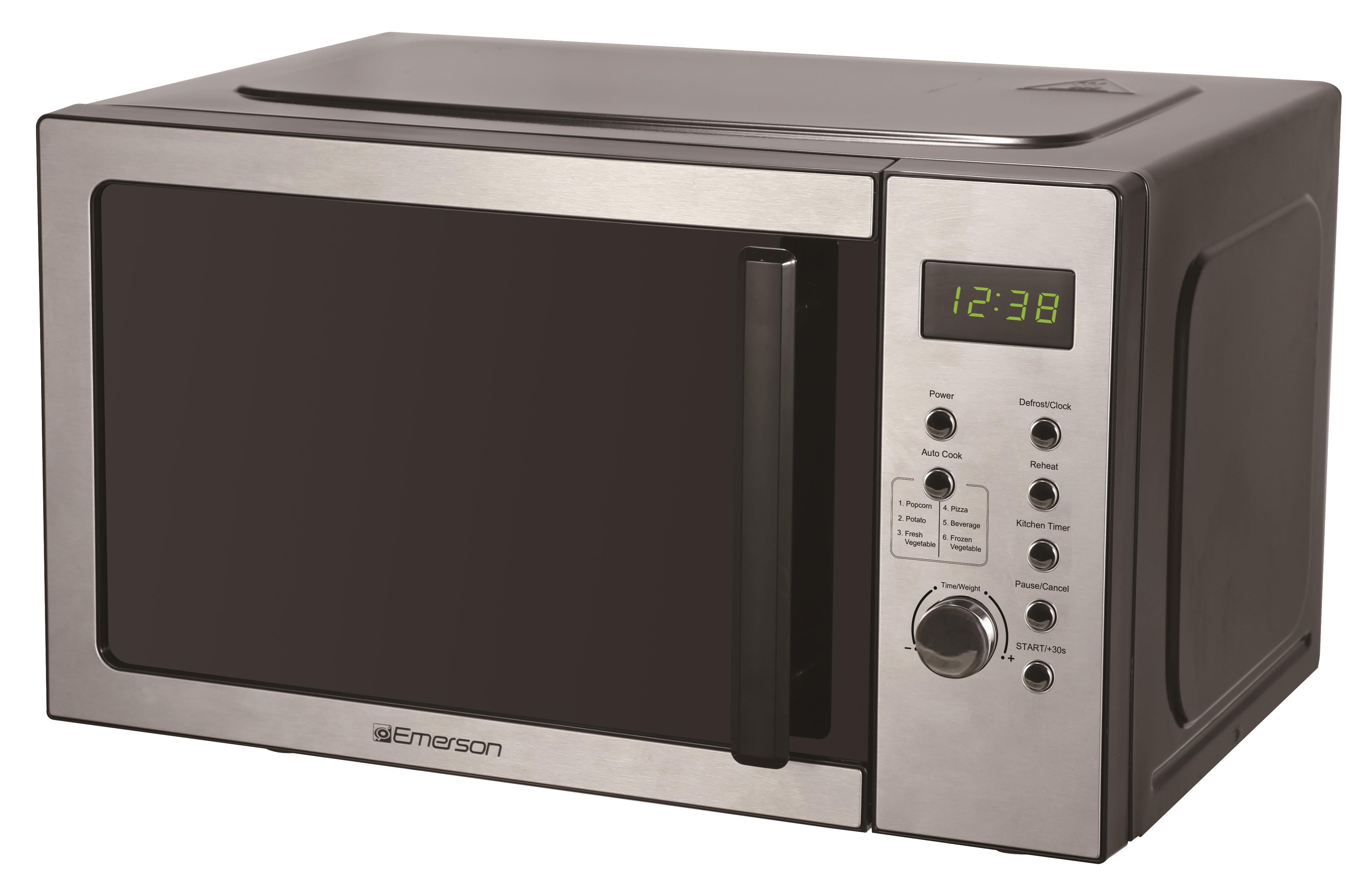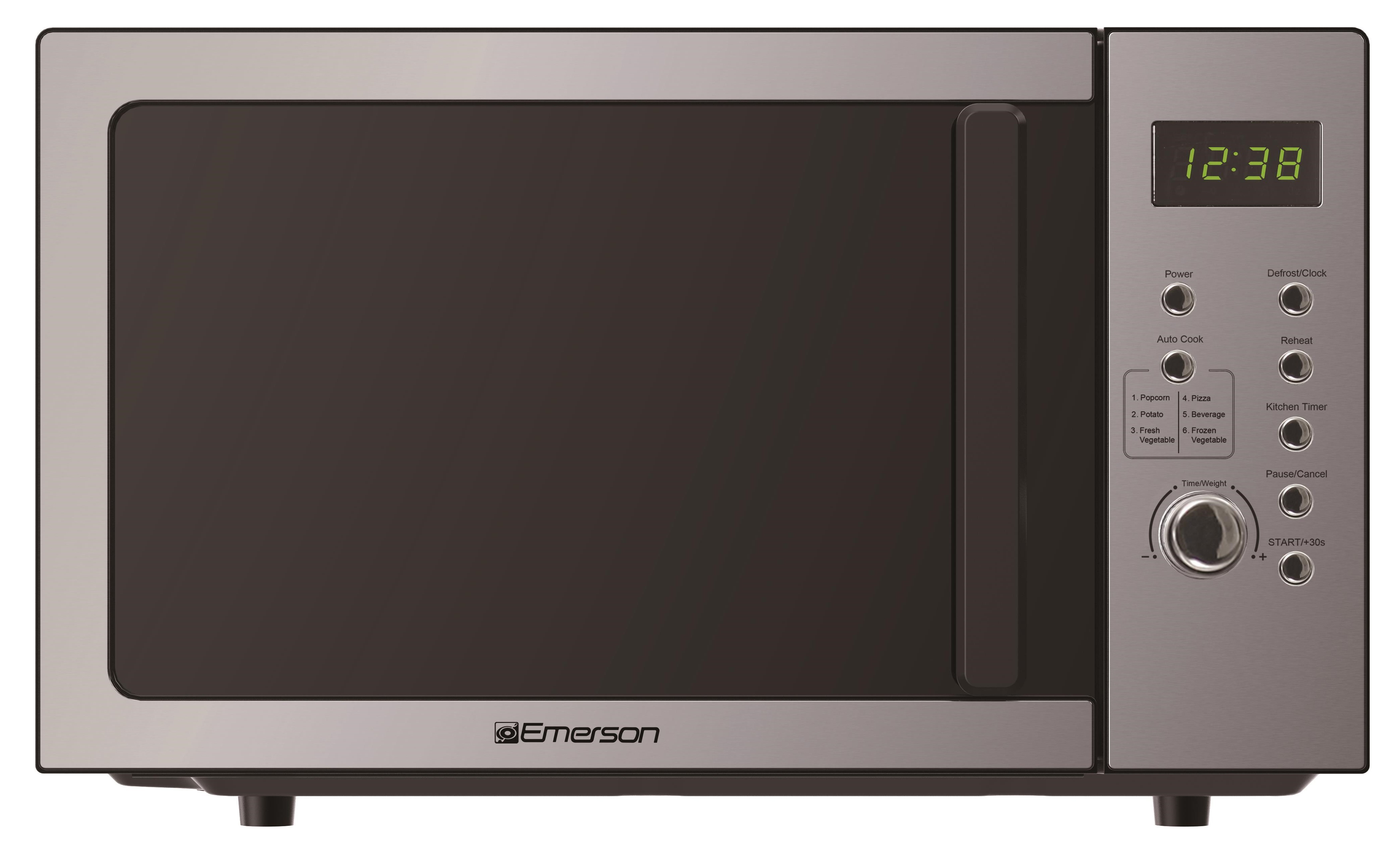 Emerson brings you a easy to operate .9 cubic foot countertop digital microwave oven. Enjoy the look of Stainless Steel Front with Black body matching most kitchen appliances. Don't fuss with a lot of buttons, select this item and have 5 power levels, 6 pre-programmed settings as well as many other options such as defrost, timer, digital clock, end of cook signal and for easy clean up, removable glass turntable. All new models include a child safety lock.Specifications