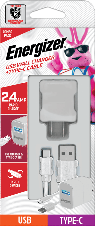 Stay powered up wherever you go with the Energizer 3ft Type-C to USB Cable and 2.4A Wall Charger. Designed for speed and convenience, this compact charging solution delivers 2.4 amps of total charging power, letting you quickly charge any Type-C device. The 3-foot cable gives you the perfect reach for comfortable use while charging, and the wall plug doubles as a versatile power source for other devices. Durable, reliable, and built to keep your devices ready when you are.Specifications