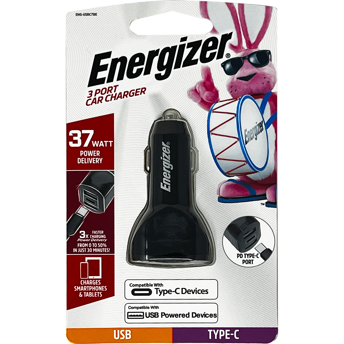 Charge two mobile devices simultaneously while you are on the go with Energizer’s 37 Watt Dual USB & Type-C Port Car Charger. With 37 Watt of dedicated power you can charge any Type-C style device and USB style device all at the same time! This charger is great for those long or short trips to keep your devices fully charged at all times.Specifications