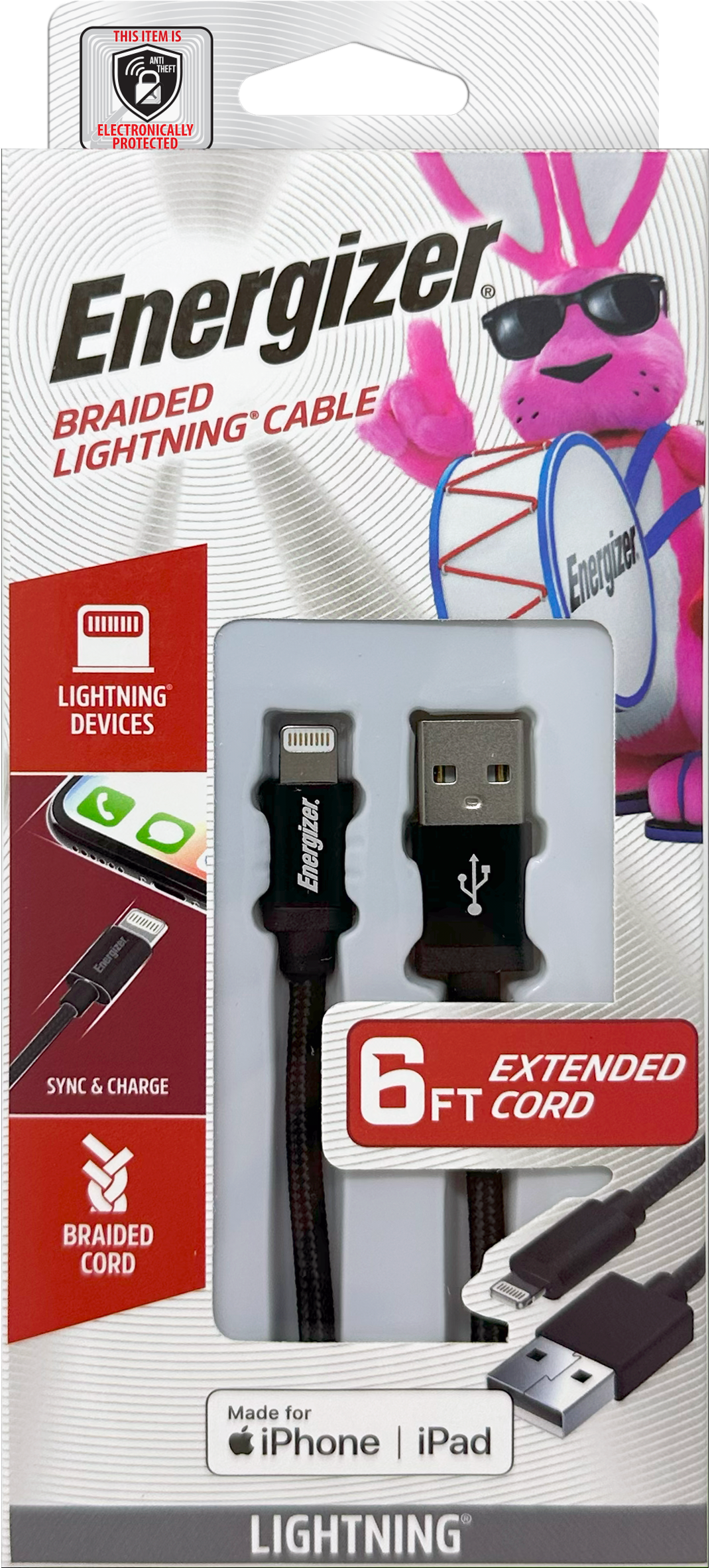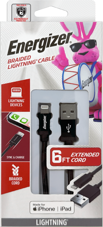 Charge and sync your Apple devices with confidence using the Energizer 6ft Braided Lightning Cable. Its durable braided design helps prevent fraying and breaking, while the 6ft length gives you extra reach and flexibility at home, in the office, or on the go. Compatible with all Lightning or 8-pin Apple devices, this cable delivers reliable power and fast data transfer every time.Specifications