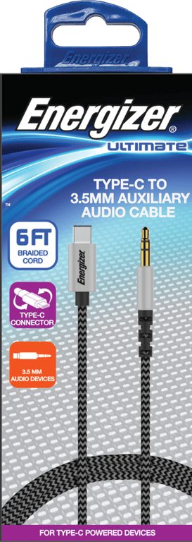 Introducing the Energizer 6ft Braided Type-C to 3.5mm Aux Cable, the perfect solution for connecting your Type-C devices to audio devices with a standard 3.5mm auxiliary input. Experience high-quality sound transmission and convenient compatibility with this durable and versatile cable.Designed to provide a seamless audio connection, this cable allows you to enjoy your favorite music, podcasts, and more on any device with a 3.5mm audio jack. Simply plug one end into your Type-C device, and the other into your headphones, speakers, or car stereo, and immerse yourself in a world of rich and immersive sound.The 6-foot length offers flexibility and convenience, allowing you to comfortably use your device while keeping it connected to your audio system. Whether you're relaxing at home, working in the office, or on the move, this cable provides the freedom to enjoy your audio content without restrictions.Crafted with a braided exterior, this cable is built to withstand daily use and resist tangles, ensuring a long-lasting and hassle-free experience. Its durable construction guarantees reliable performance, making it an ideal choice for music enthusiasts and audio professionals alike.Specifications