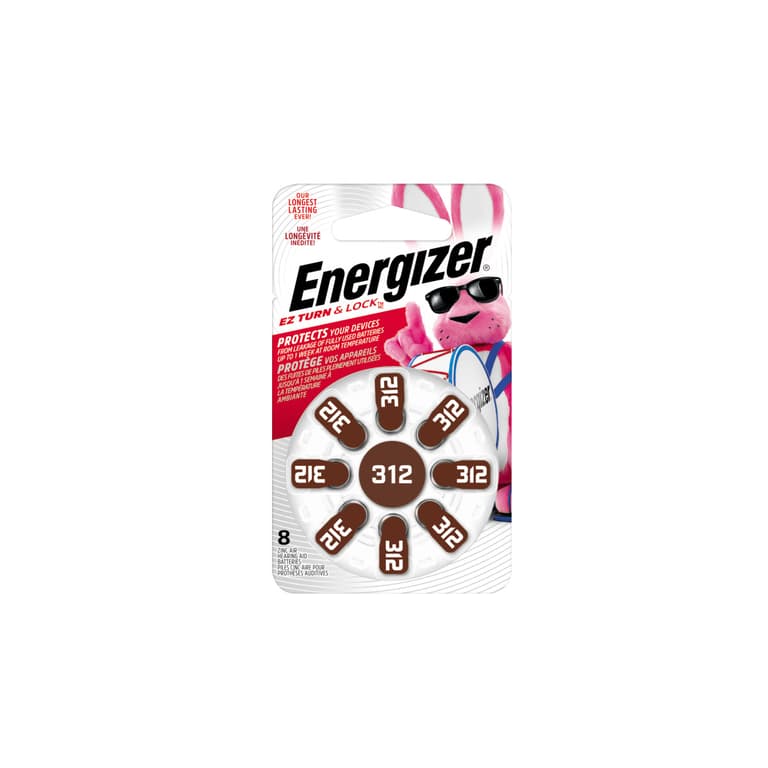 1 package of 8 size 312 zinc hearing aid batteries with EZ Turn & Lock design; Easier to open package handle and insert batteries with longer color-coded tabs; Energizers longest-lasting zero-mercury hearing aid battery; EZ Turn & Lock 100% recyclable packaging keeps unused batteries secure and airtight