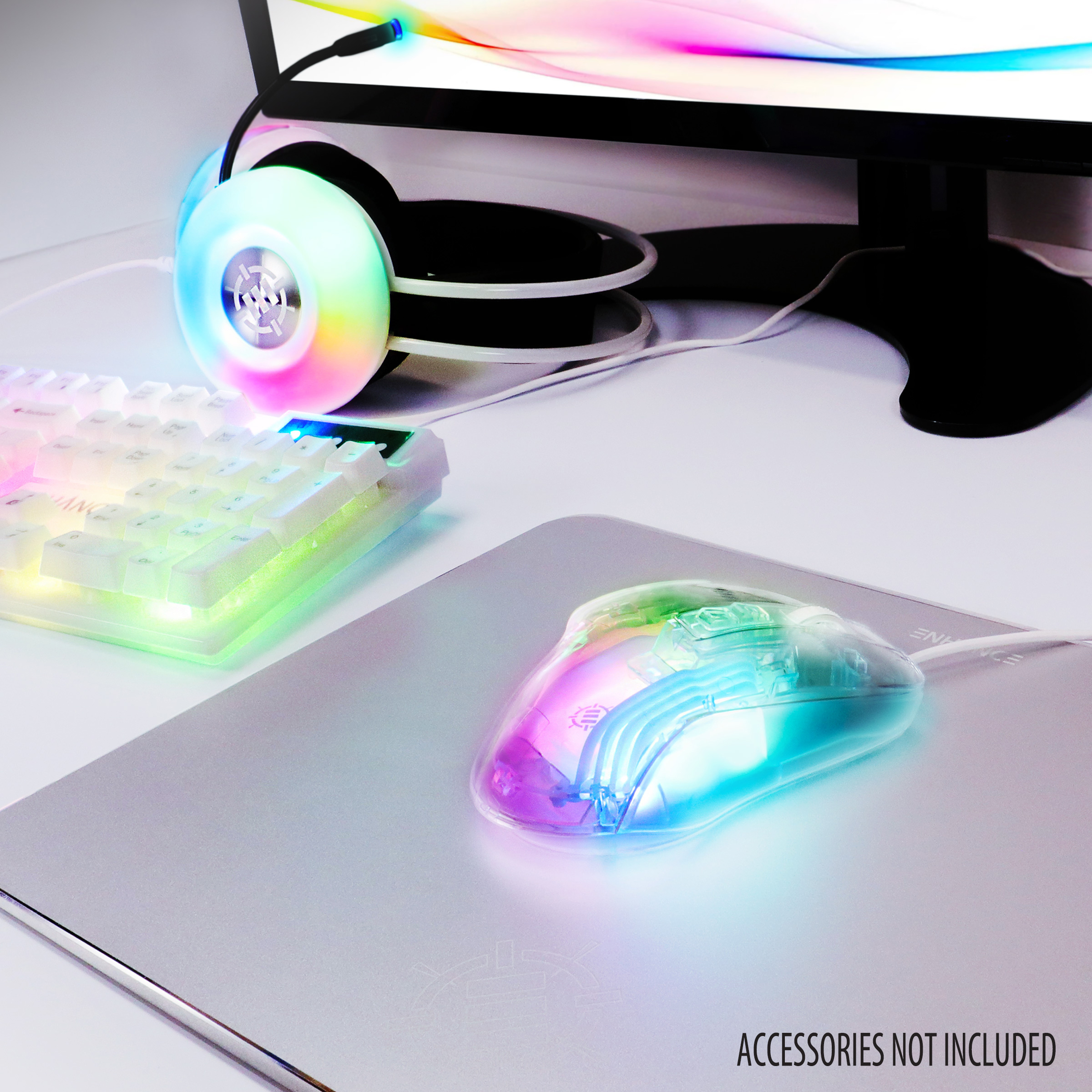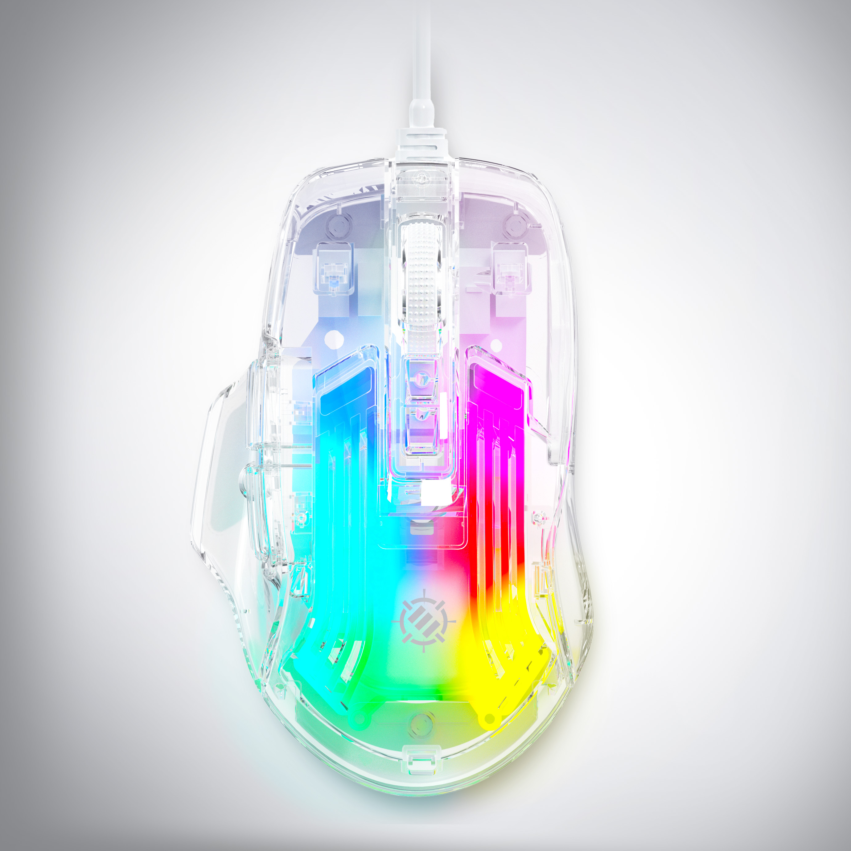 ENHANCE Theorem 3 Gaming Mouse. This mouse features a sleek white and clear design with color-changing LEDs and 12 lighting modes, creating a unique visual appeal. It has a high DPI optical sensor with six sensitivity settings (800 to 7200 DPI), making it versatile for both precise control and quick movements. The mouse includes seven programmable buttons, allowing for custom functions and macros, which are particularly useful for MMO and MOBA games. Users can customize button functions or set up macros for complex actions. Its ergonomic shape and contoured side grips enhance comfort and control during extended use.Specifications