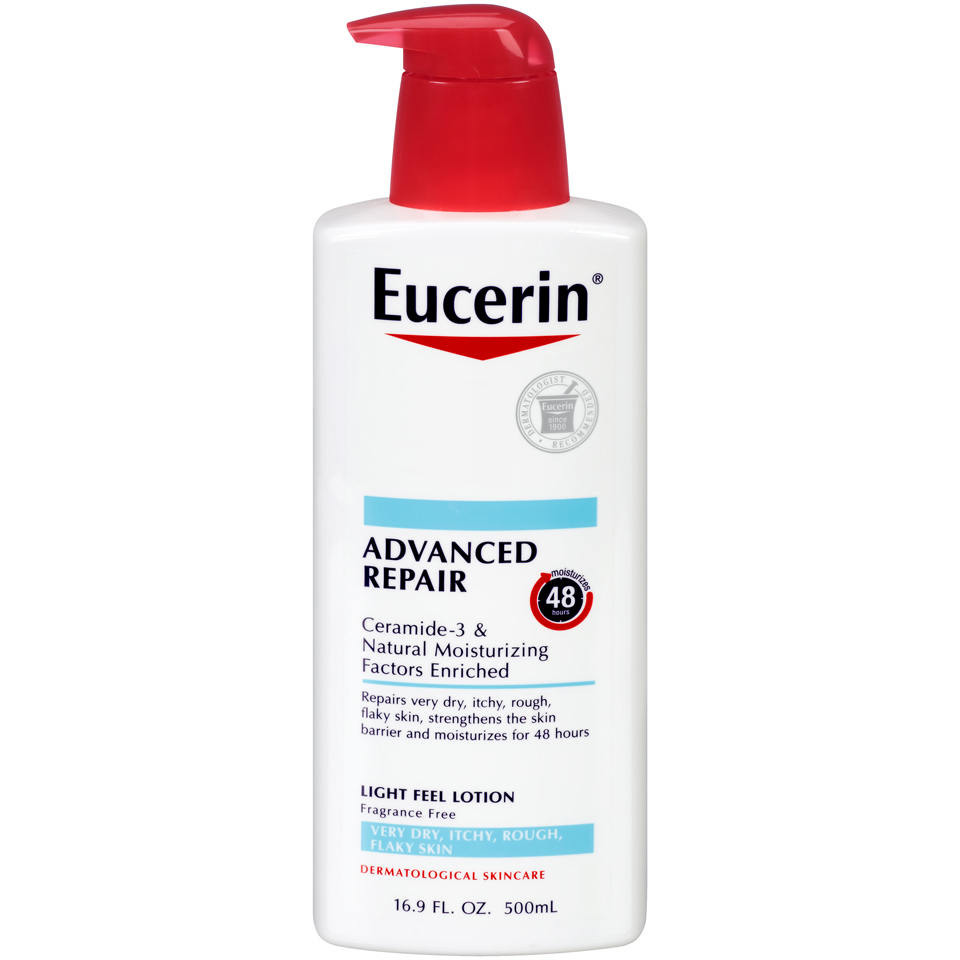 Eucerin Advanced Repair Lotion is a breakthrough in repairing very dry skin and fighting dryness at its source. It provides 48 hour moisture, for skin that looks and feels healthy. This body lotion for dry skin is enriched with ceramides-3 and natural moisturizing factors. Ceramides help to strengthen the skins moisture barrier to lock in moisture. Amino acids that are naturally found in the skin, boost moisture and prevent dryness from reoccurring. Eucerin Advanced Repair Body Lotion is a lightweight and fast-absorbing formula that smoothes, repairs & hydrates dry skin. This body lotion is fragrance free, dye free, paraben free and is gentle enough for everyday use.Specifications