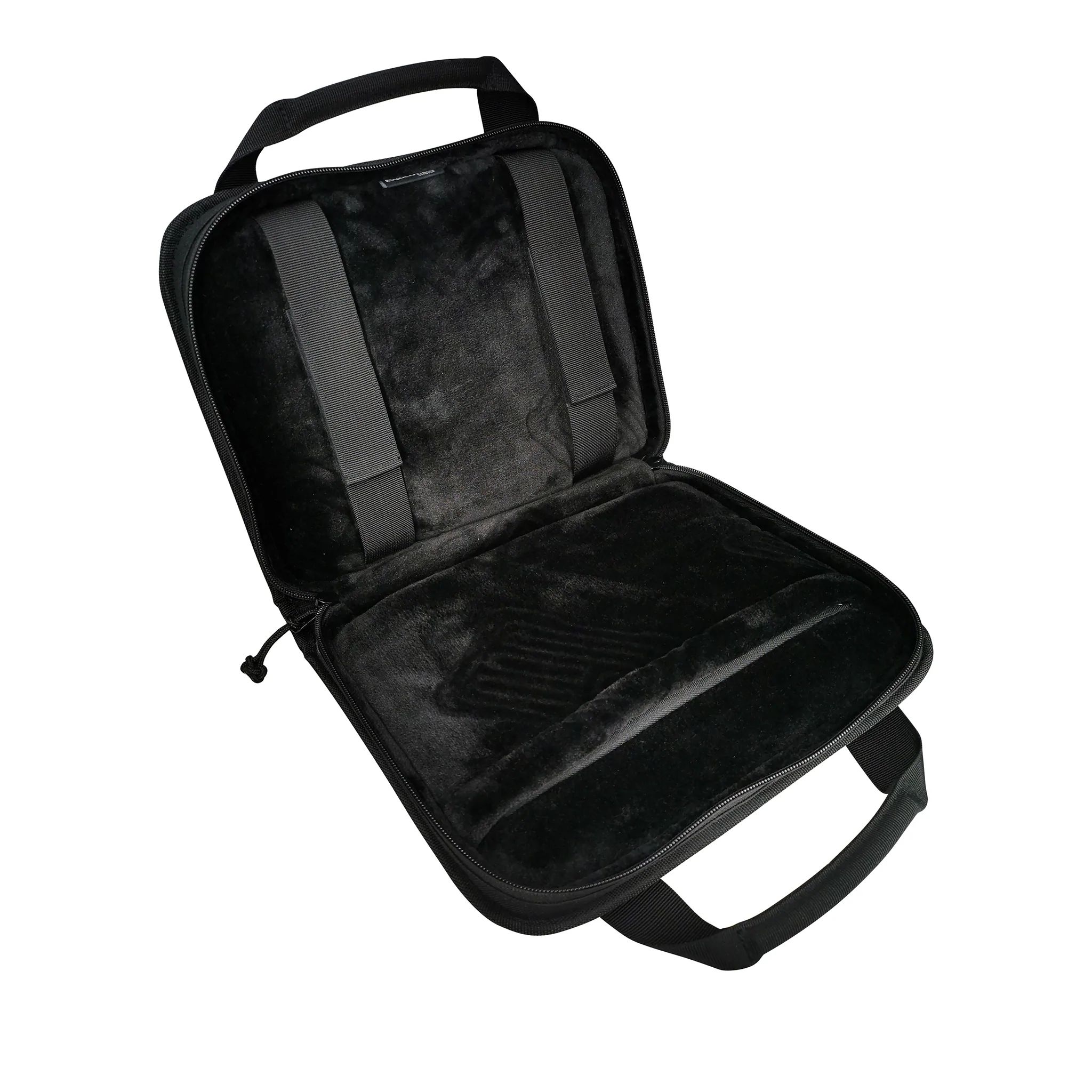 hook and loop tie straps to secure a firearm; Interior zippered pocket; Matte finish EVA construction; Padded foam material for firearm protection; Paracord zipper pulls; Soft debossed fleece interior lining; Tubbed top carry handles for comfort