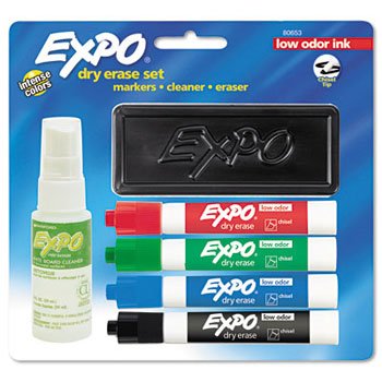 Produce colorful whiteboard presentations with the black/ red/ green and blue markers in this starter set. The nontoxic markers are made using a low-odor formula and feature a chisel tip for fine or bold markings. The cleaner solution in this Expo dry-erase starter set removes any stubborn markings or smudges from whiteboard surfaces.Specifications