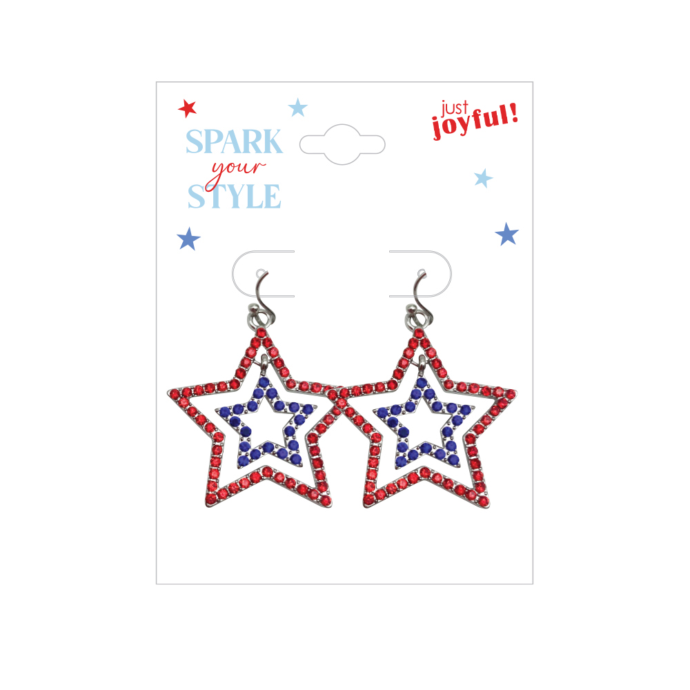 Bold red, white, and blue star-shaped earrings outlined with sparkling accents. A fun patriotic statement piece that brings vibrant flair to summer outfits, holiday parades, and festive celebrations.Specifications