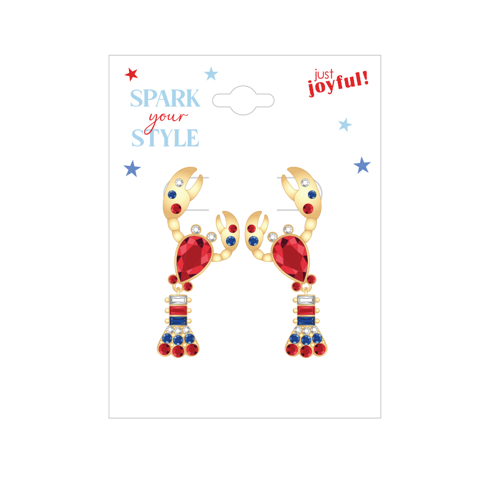 Whimsical red, white, and blue lobster earrings accented with sparkling stars. A playful coastal-patriotic accessory that adds bold charm to summer outfits, beach celebrations, and festive holiday events.Specifications