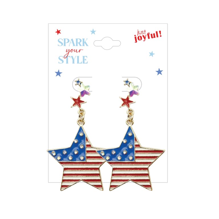 Bold star-shaped earrings decorated with classic stripes and sparkling accents. Lightweight and eye-catchingideal for showing off your patriotic pride in style.Specifications