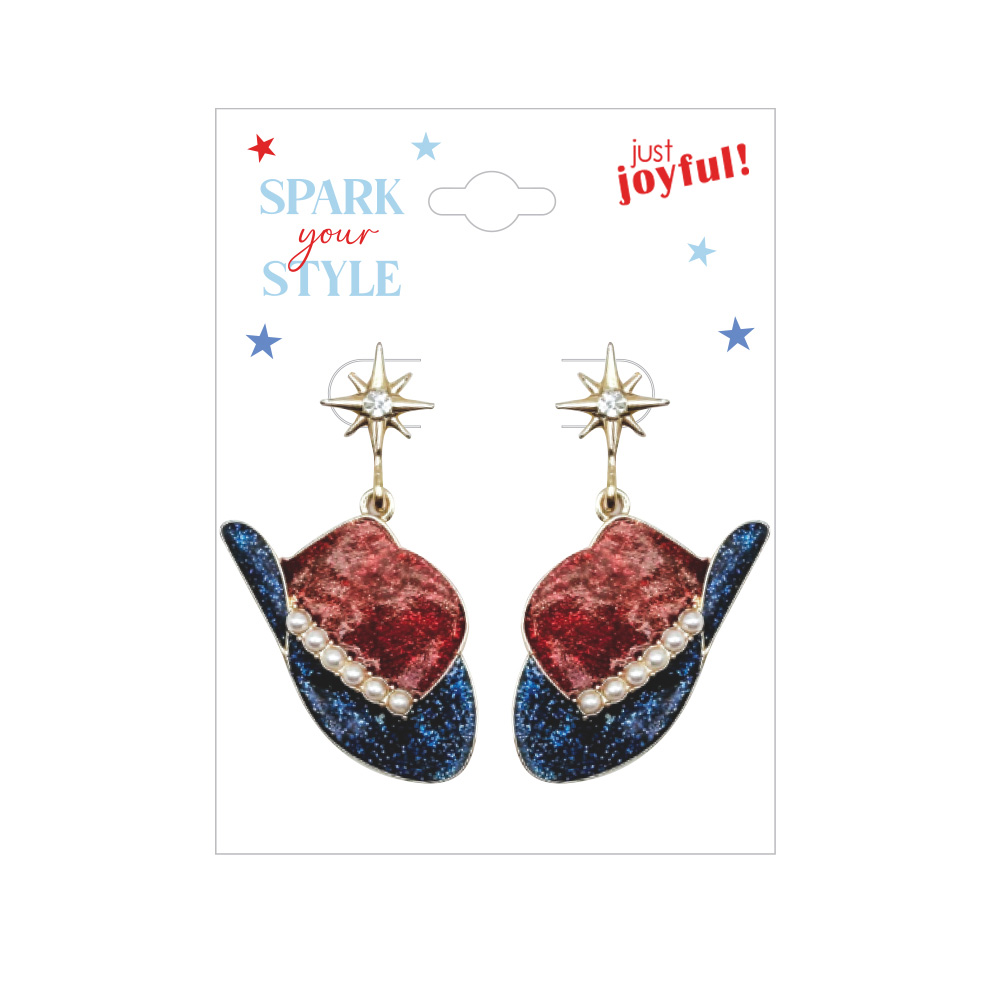 Playful red, white, and blue cowboy hat earrings topped with sparkling starbursts. A spirited Western-patriotic accessory that adds festive charm to summer outfits, holiday cookouts, and star-spangled celebrations.Specifications