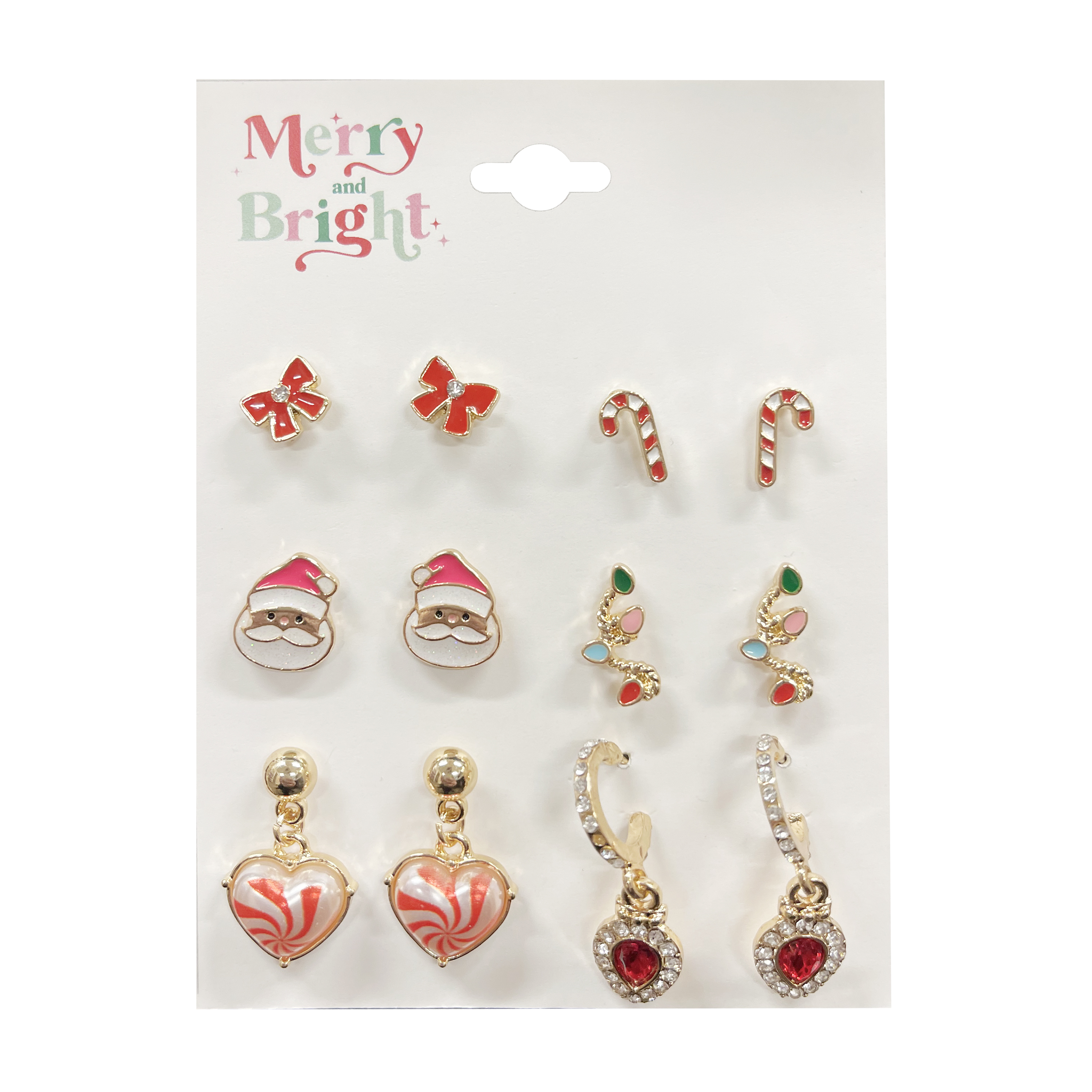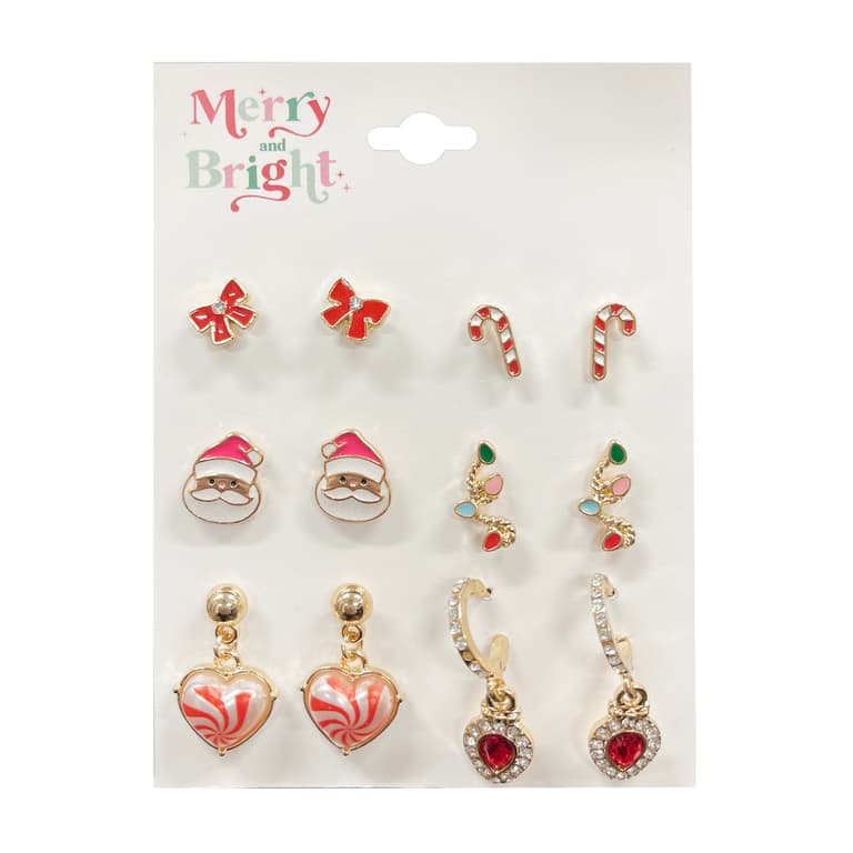 Add festive sparkle to your season with this delightful earring set featuring candy canes, Santa faces, holiday lights, bows, peppermint hearts, and dazzling red gems. With a mix of fun studs and elegant drops, it's perfect for creating cheerful looks all holiday long.Specifications
