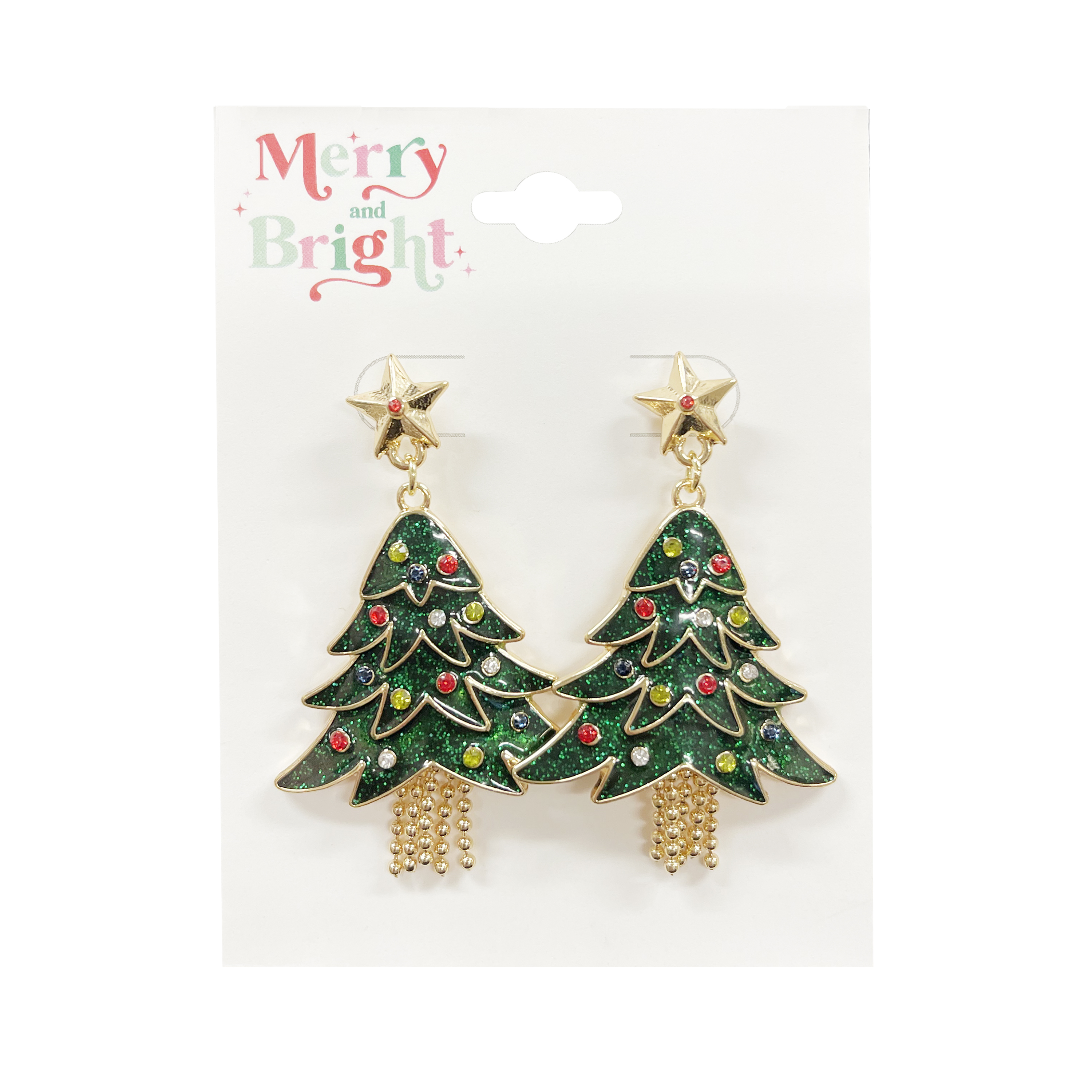 Add festive flair to your holiday outfit with these charming Christmas tree earrings! Featuring glittery green trees adorned with colorful ornaments and dangling gold chain trunks, they’re topped with a gold star for the perfect seasonal sparkle.Specifications