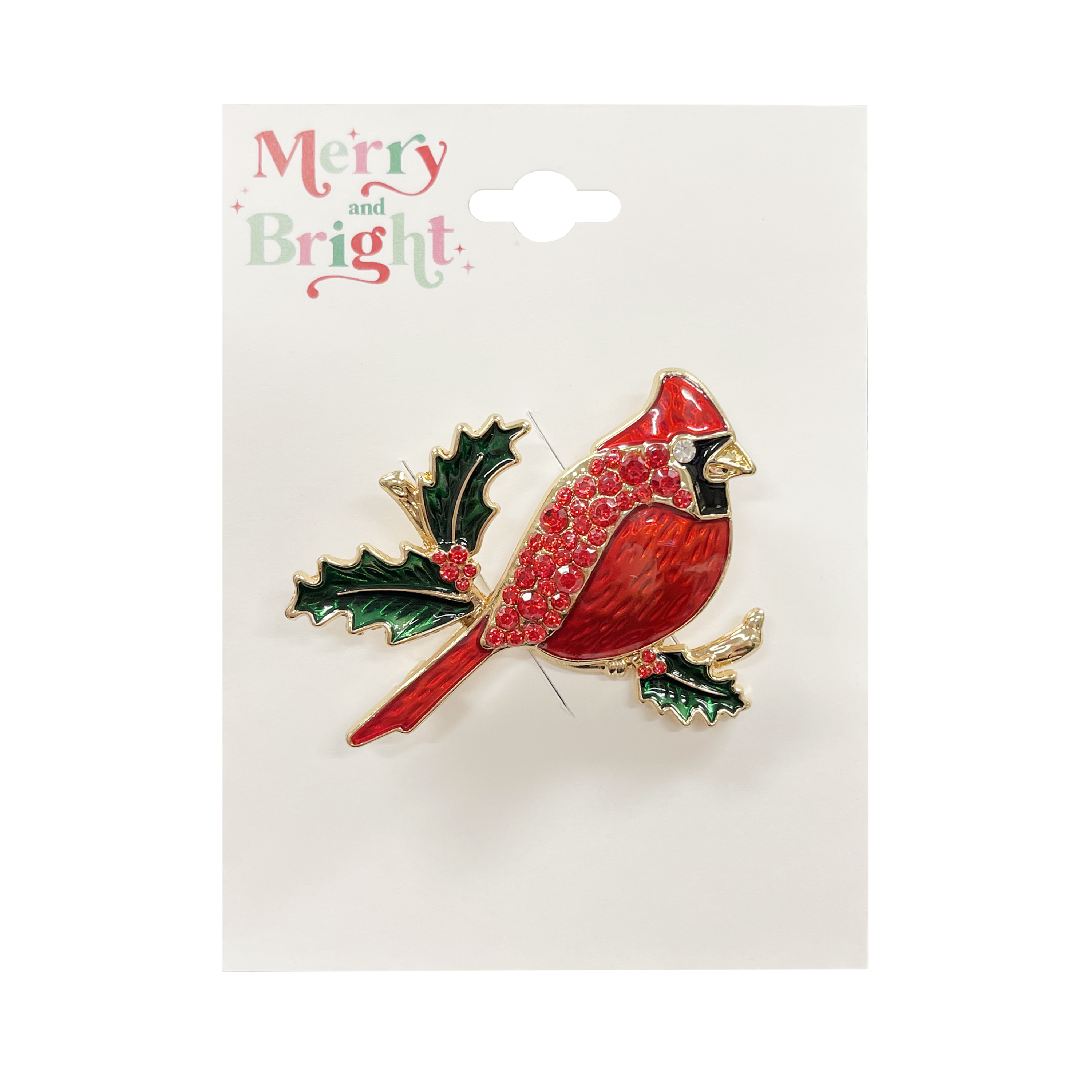 Celebrate the season in style with this vibrant cardinal brooch, featuring rich red enamel, sparkling rhinestones, and festive green holly accents. This eye-catching accessory brings a cheerful pop of color to any holiday outfit, coat, or bag.Specifications