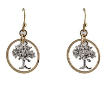 Silver Tree in Gold Circle; Tree Earrings; Tree in Circle