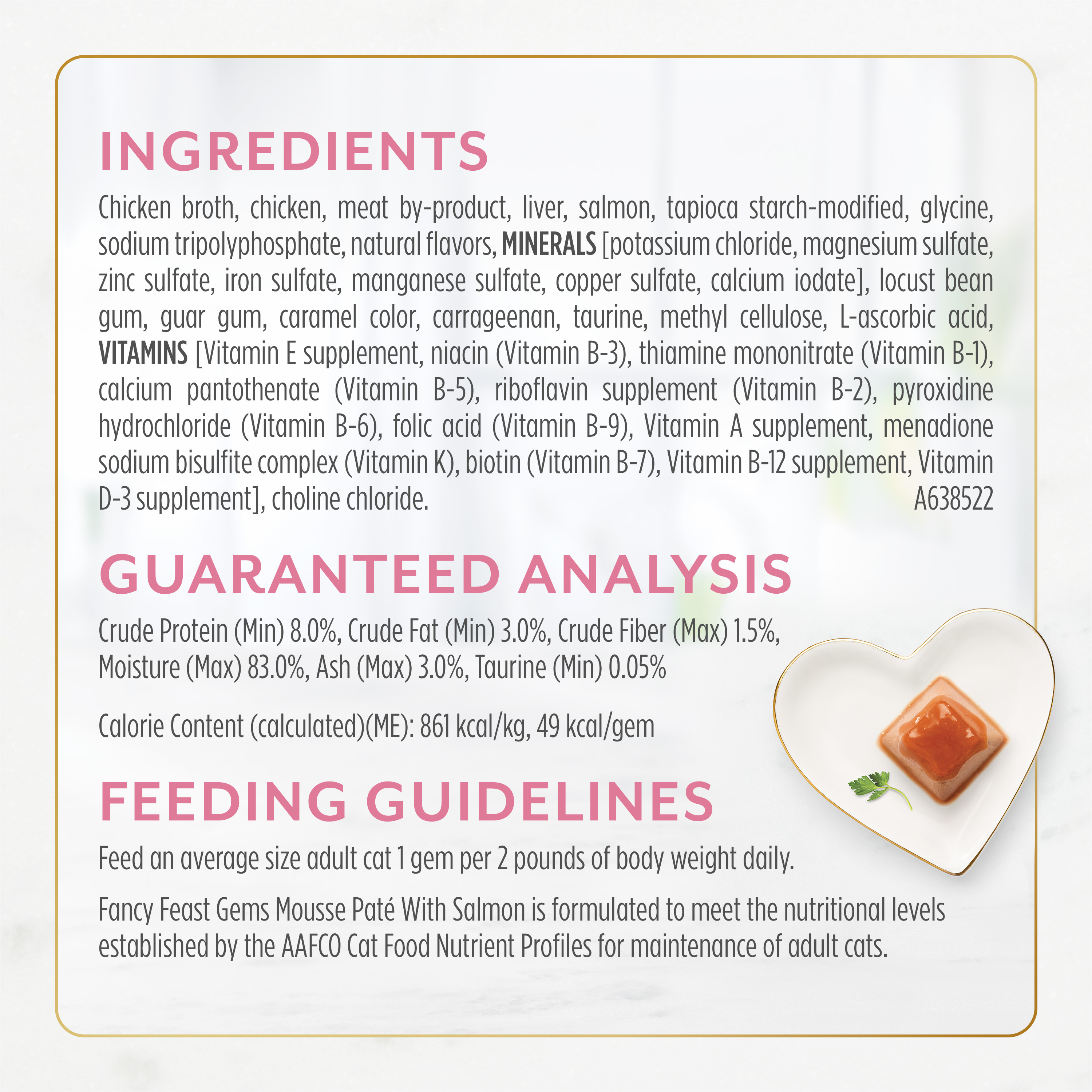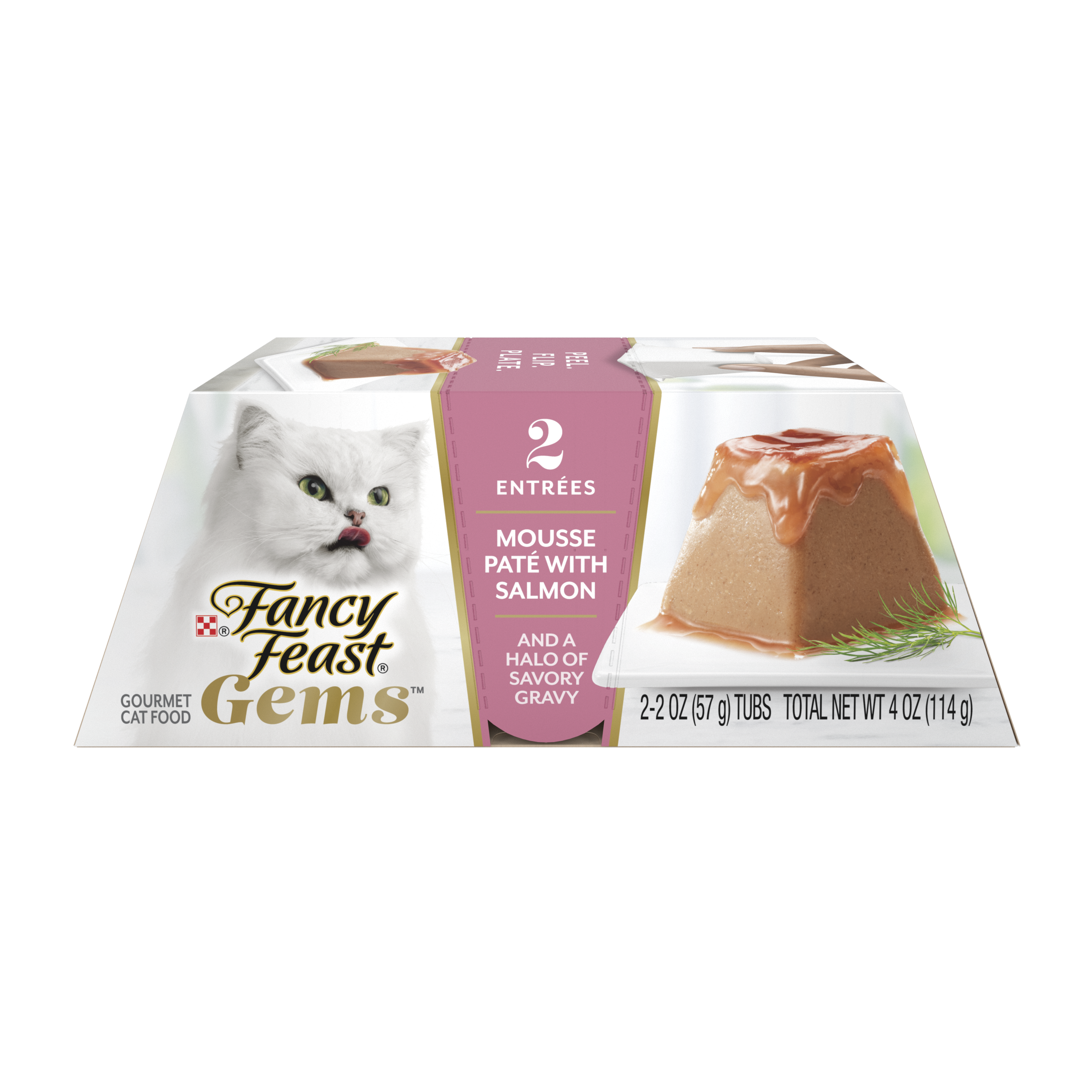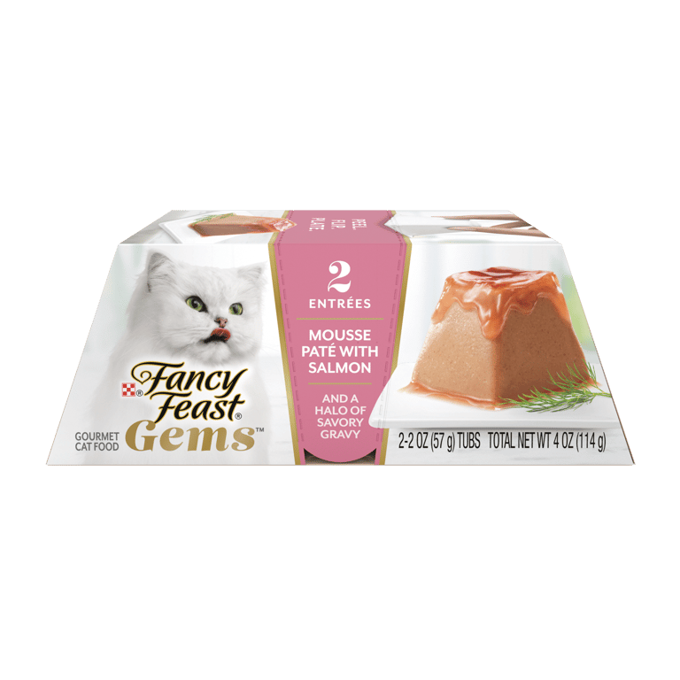 Introducing our most elevated mealtime experience yet: Fancy Feast Gems Mousse Salmon Wet Cat Food Pate With Salmon and a Halo of Savory Gravy. This mouthwatering mousse cat food is topped with wet cat food gravy, creating a cascade of savory cat gravy that transforms mealtime into marvelous. Crafted with high-quality salmon, this pate wet cat food in a pyramid-shape makes eating delightful for cats. Each serving peels and plates easily with two servings in every pack to turn everyday into the extraordinary for your cat's most exquisite eating experience yet. Your cat deserves a meal as unique as they are, so serve them a Fancy Feast Gems Pate today. Every Fancy Feast Wet Cat Food meal is thoughtfully crafted and tested for quality and safety in Purina-owned facilities. Feeding your cat is an opportunity to bring you and your cat closer together, which is why Fancy Feast has dedicated more than 30 years to developing gourmet recipes for cats and their owners to explore together.Specifications