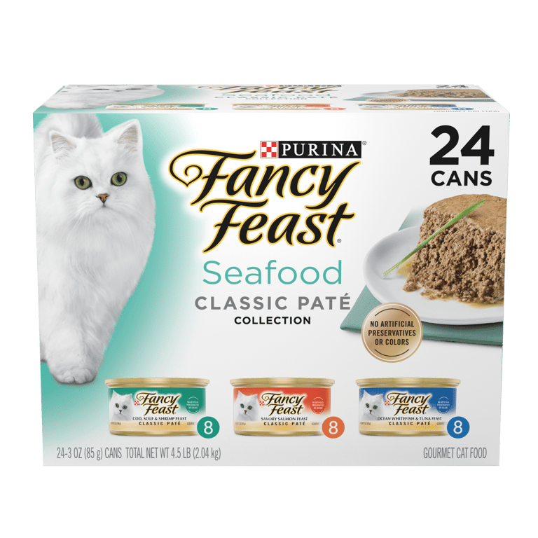 Bring the tastes of the ocean to your cats dish with Purina Fancy Feast Classic Seafood Feast Collection cat food. This soft cat food variety pack features a delicious assortment of wet cat food entrees made with real fish and seafood to satisfy her cravings for delectable goodness. The smooth pate texture is pleasing to her palate and the high-quality canned cat food recipes let you feel good about filling her dish every day. With essential vitamins and minerals to support her overall health and wellness this wet cat food variety pack makes it easy to care for your cats nutritional needs.Specifications