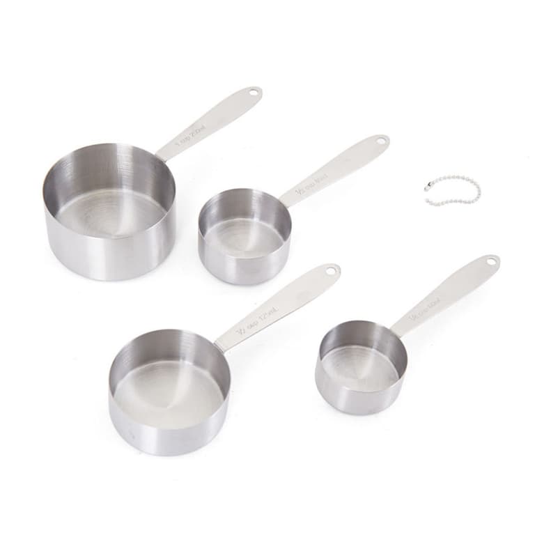 4-Piece Measuring Cup Set; Cups are attached with a ring and nest for compact storage.; Easy-to-read measurements; Expertly crafted from quality stainless steel; Ideal for both wet and dry ingredients; Takes the guess work out of cooking and baking