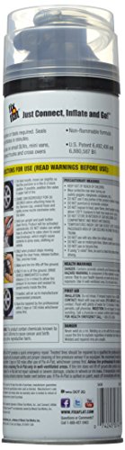 Hose top works on all wheels; Non-flammable formula is safe and easy to cleanup with water; Seals and inflates in seconds; Seals tread area punctures up to 3/16-inch in diameter