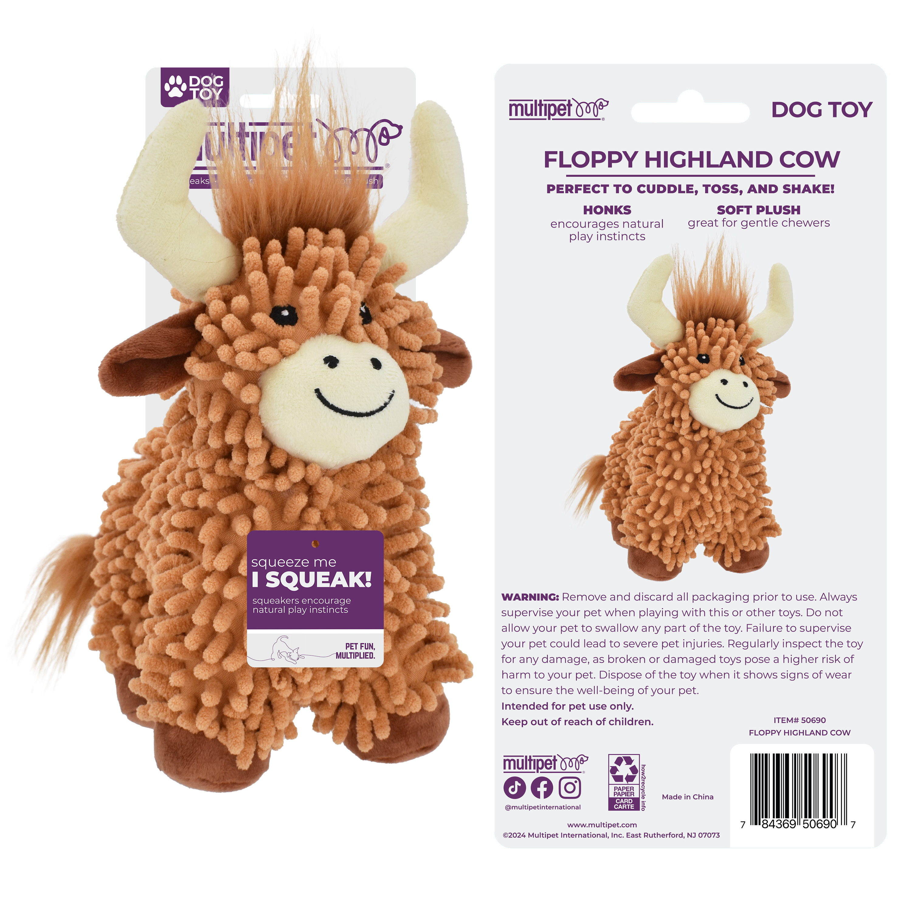 Multipet's Floppy Highland Cow is a plush dog toy with a soft exterior. This toy is perfect for cuddles and playtime. Includes a squeaker. Assorted colors.Specifications