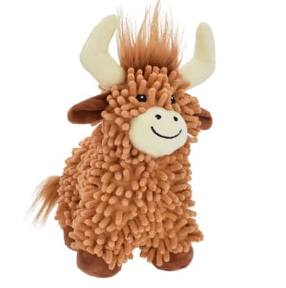 Multipet's Highland Cow is a soft, adorable, fluffy highland cow; Perfect for cuddles, and includes a squeaker for playtime fun