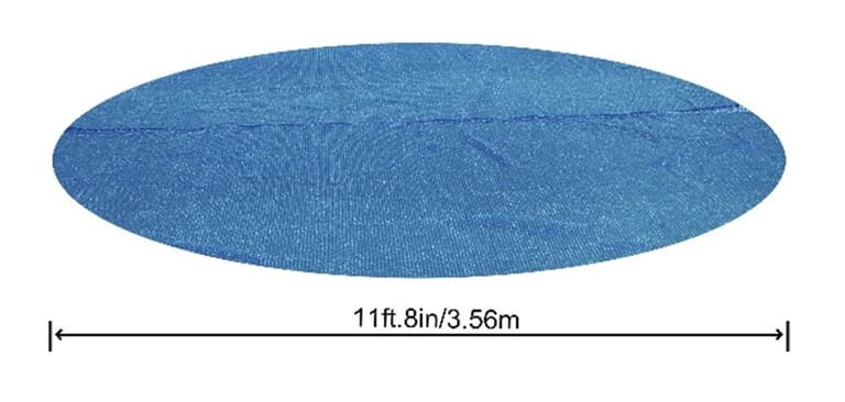 11ft.8in. / 3.56 m; Carrying bag with insert; Content: One solar pool cover; Durable material; Fits 12 ft. /13 ft. Fast Set Pools and 12 ft. Steel Pro Pools and 12 ft. Steel Pro MAX Pools; Minimizes pool debris; Solar cover can be adjusted to fit pool size; The solar cover utilizes solar energy to warm the pool water and prevents heat from escaping