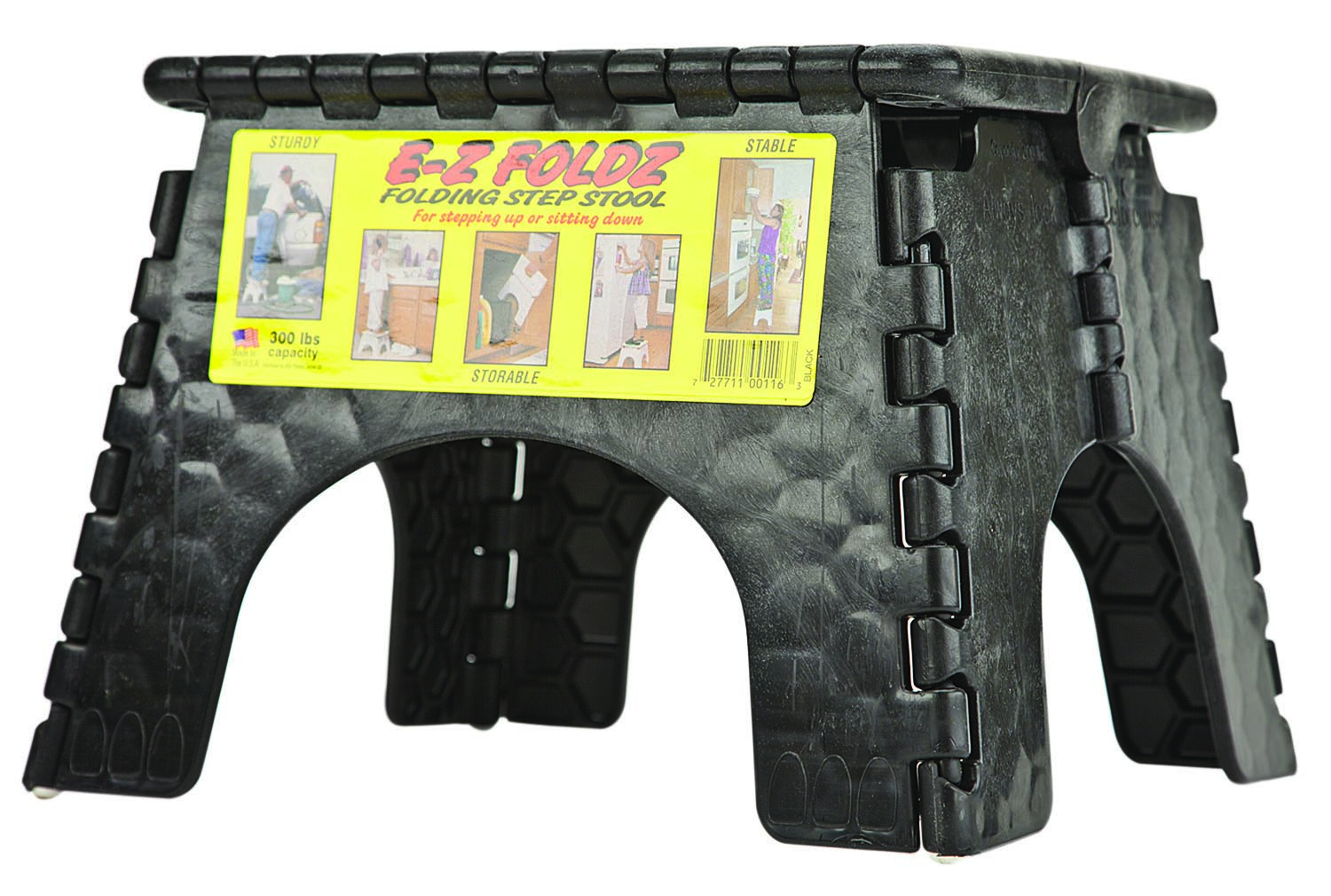 E-Z Fold Step Stools in two colors black and grey, Convenient for Kitchen, Bathrooms, Garage, Closet, Playroom, Gardening, Camping, RV-ing. Stand 9" High and folds for easy storage.Specifications