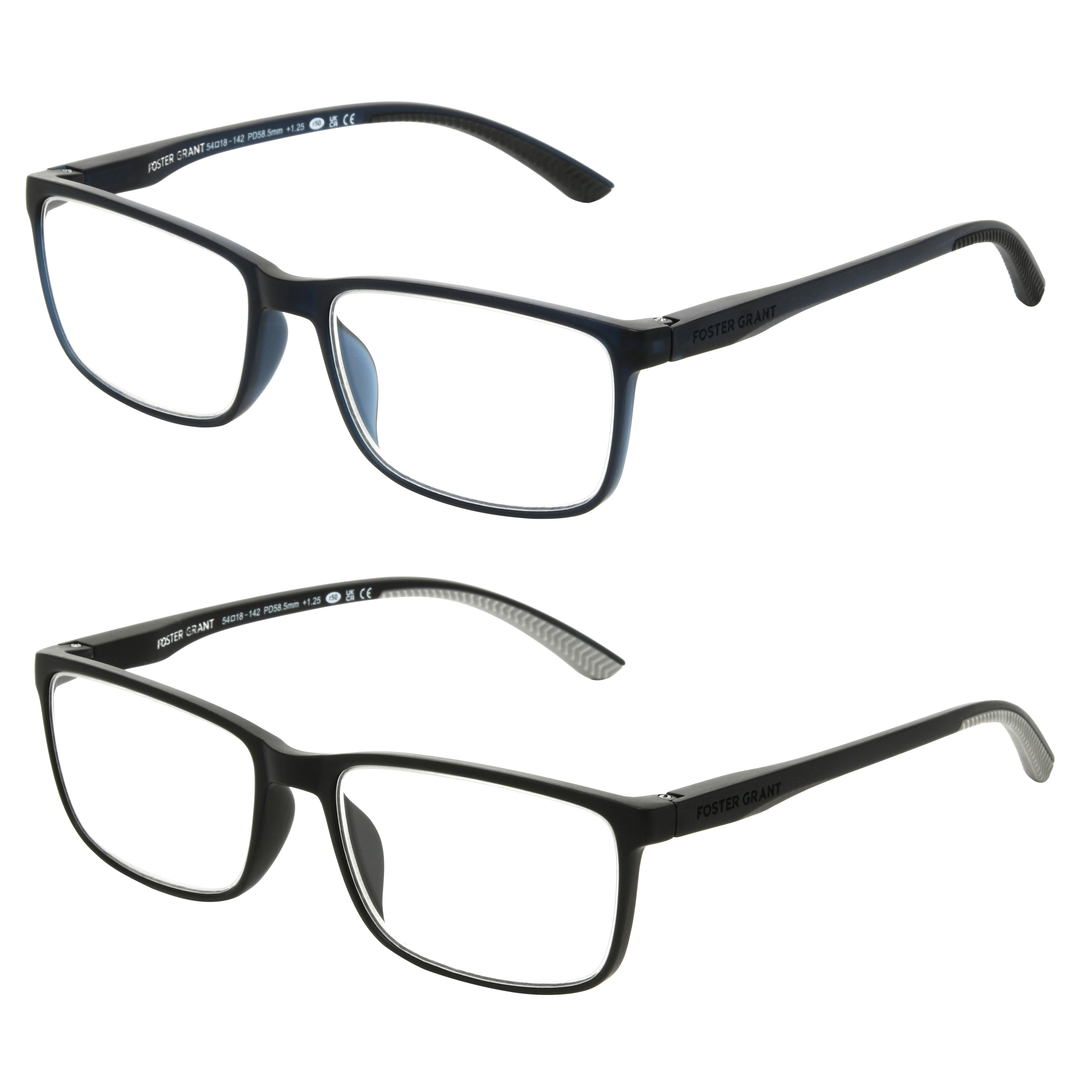 Upgrade your style with the Double 2-Pack by Foster Grant Rectangle Reading Glasses!This double pack includes a pair with sleek black frame fronts and dark gray temples and a pair of navy frames, both in a classic, rectangle shape with spring hinges for a flexible, secure fit. Ideal for those who value both style and functionality.Specifications