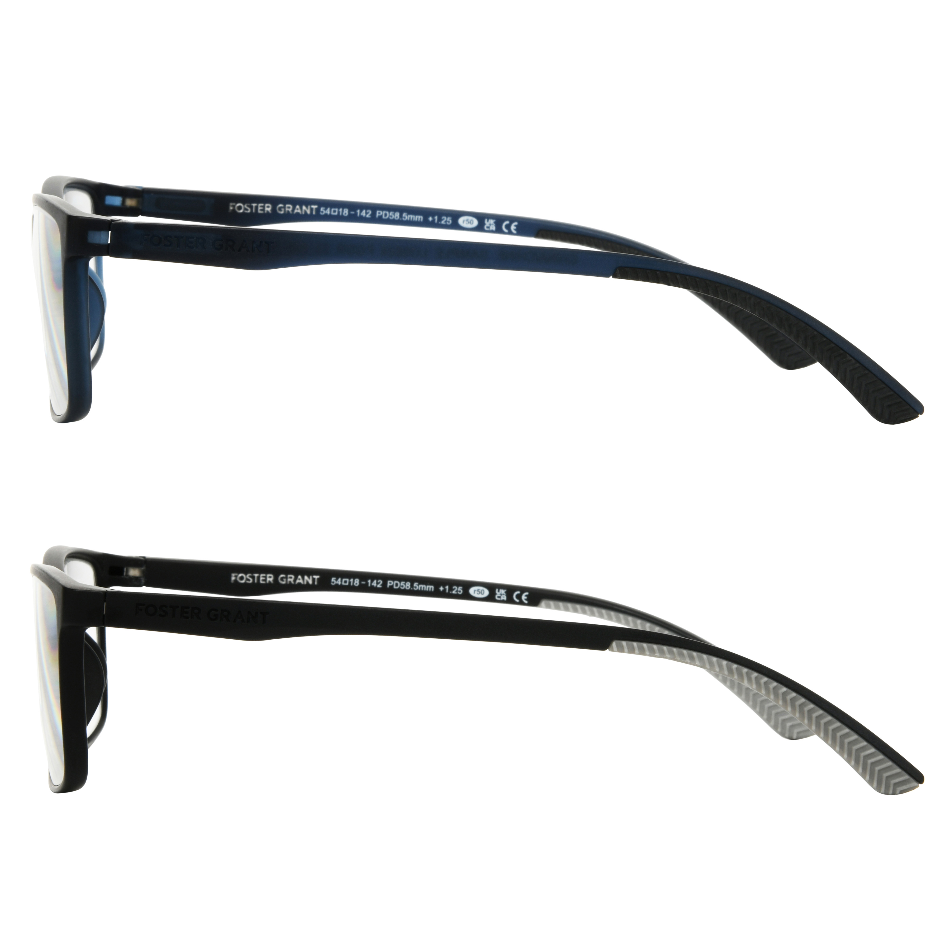 Upgrade your style with the Double 2-Pack by Foster Grant Rectangle Reading Glasses!This double pack includes a pair with sleek black frame fronts and dark gray temples and a pair of navy frames, both in a classic, rectangle shape with spring hinges for a flexible, secure fit. Ideal for those who value both style and functionality.Specifications