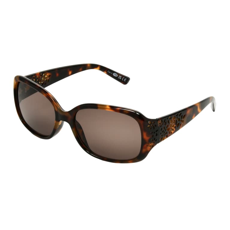 These Foster Grant Ladies Fashion Oval Sunglasses feature an elegant oval shape with a rich tortoise frame accented by sparkling details along the temples. The full-rim design balances timeless sophistication with a touch of glamour, perfect for elevating any look. The lenses, made with recycled plastic, are scratch and impact-resistant and provide 100% UVA-UVB lens protection. A stylish blend of durability and everyday elegance.Specifications