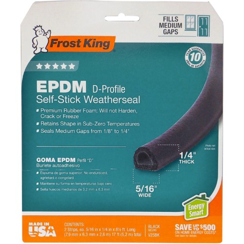 Keep the cold and wetness of the winter season out of your home with the EPDM D-Profile Self Stick Weatherseal from Frost King. Designed to protect medium sized gaps, this high quality weather seal is made from premium rubber foam, and will not harden or crack in freezing temperatures! Energy efficient and suitable for use on both doors and windows, the EPDM D-Profile Self Stick Weatherseal from Frost King is very easy to install.Specifications