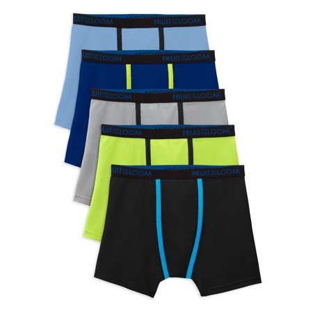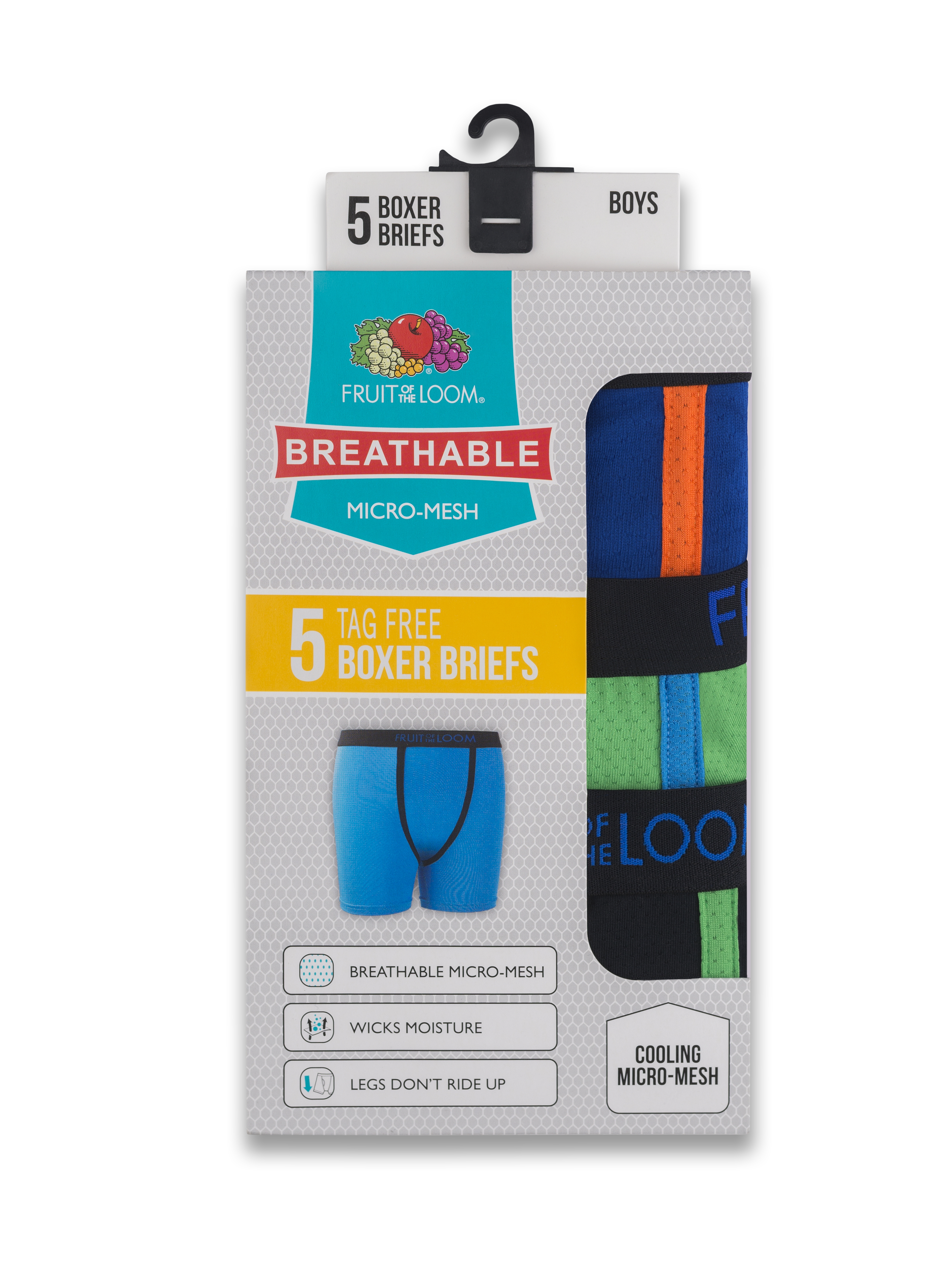 WE CANNOT GUARANTEE A SPECIFIC COLOR. FRUIT OF THE LOOM BOYS BREATHABLE MICRO MESH BOXER BRIEFS FEATURE SOFT LIGHT WEIGHT MICRO MESH FABRIC THAT PROMOTES AIR FLOW PREVENTING YOUR SON FROM GETTING HOT. THE MOSITURE WICKING TECHNOLOGY DISTRIBUTES SWEAT AWAY FROM THE SKIN KEEPING HIM DRY THROUGHOUT THE DAY. THESE BOXER BRIEFS FEATURE A CONTOURED POUCH FOR ADDITIONAL SUPPORT.Specifications