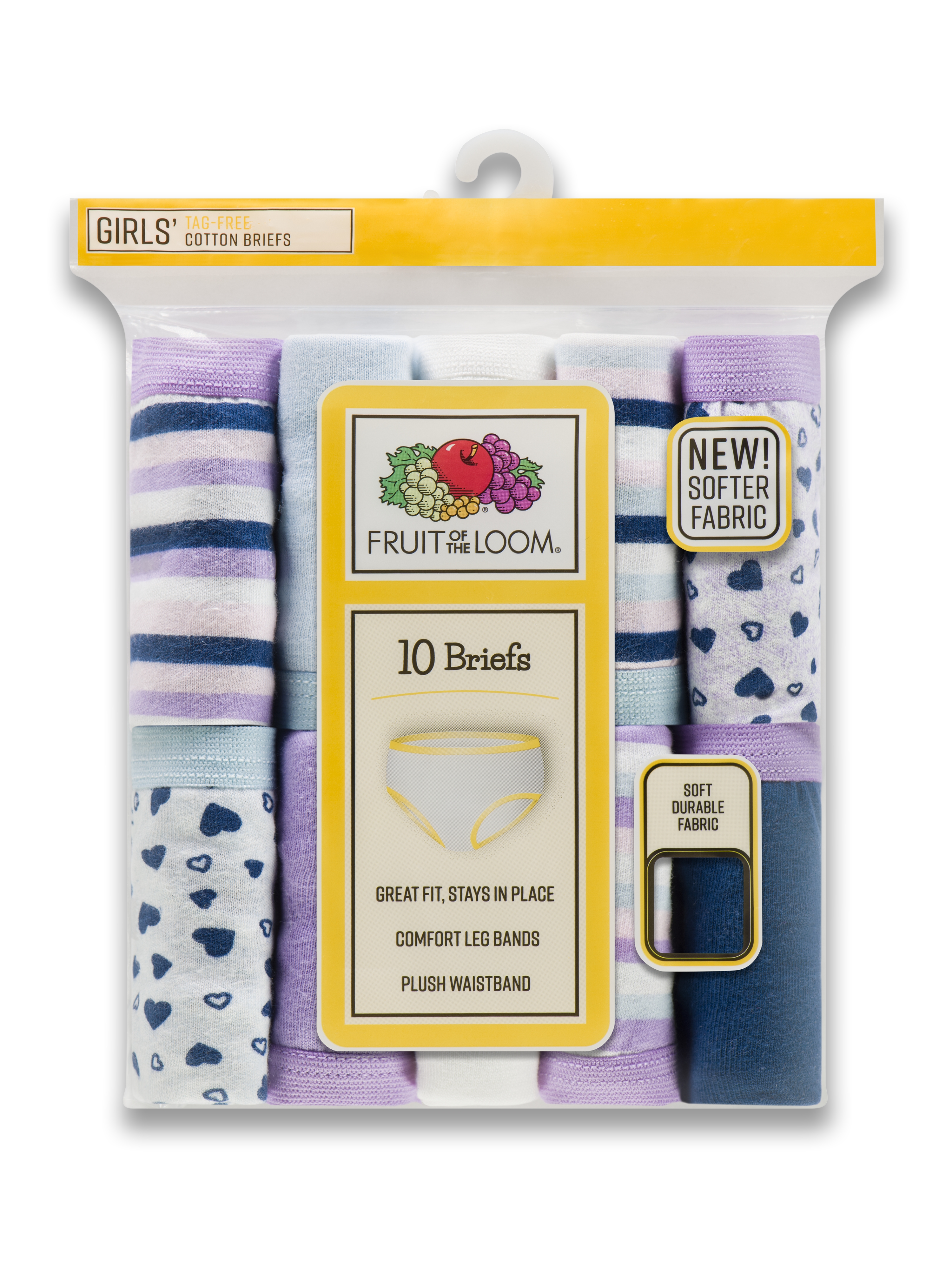 WE CANNOT GUARANTEE A SPECIFIC COLOR. FRUIT OF THE LOOM GIRLS COTTON BRIEFS ARE BREATHABLE DURABLE TAG FREE AND HAVE A RAVEL FREE WAISTBAND. THIS BRIEF INCLUDES A COMBINATION OF CUTE PRINTS AND FASHIONABLE SOLIDS THAT ARE SURE TO BECOME HER NEW FAVORITE.Specifications