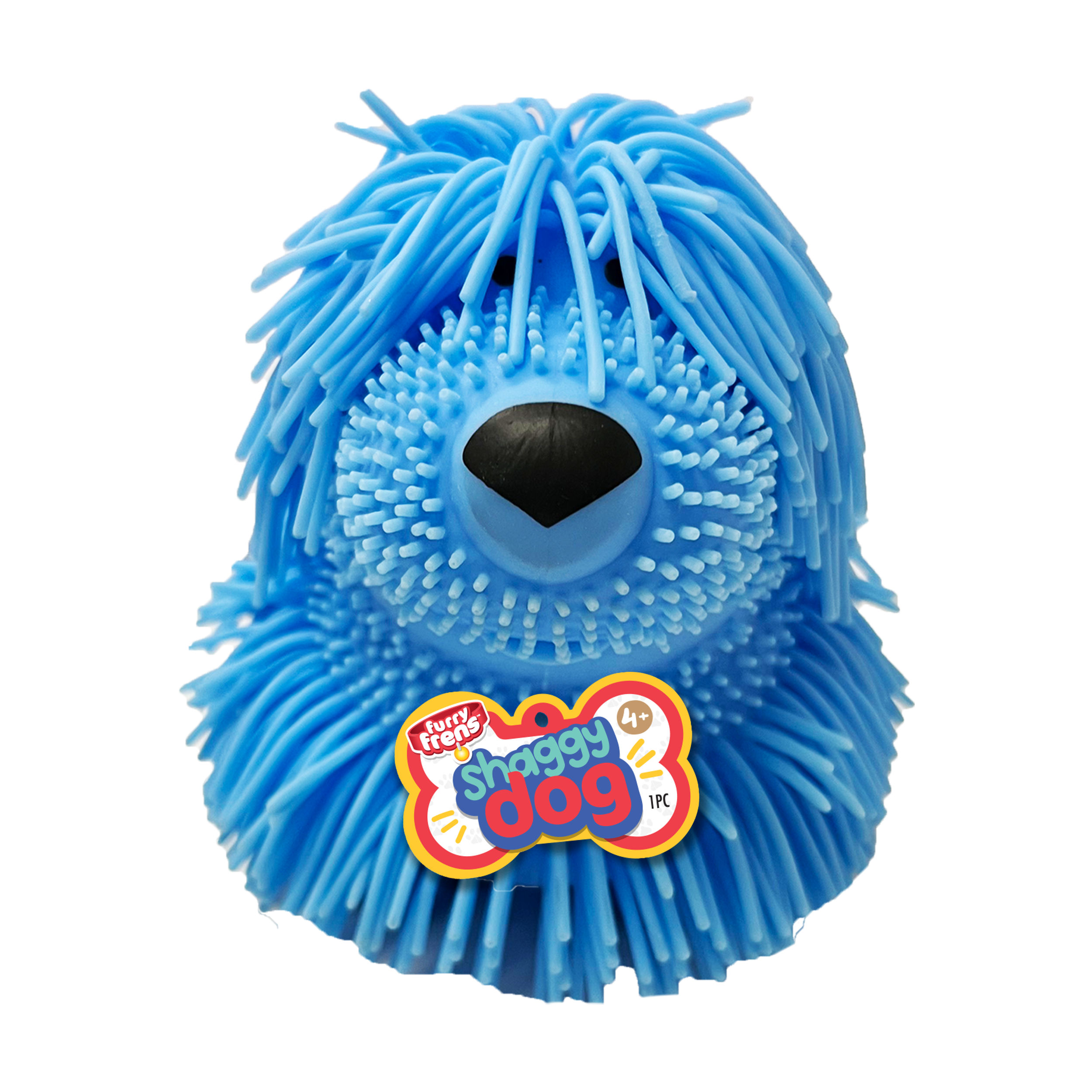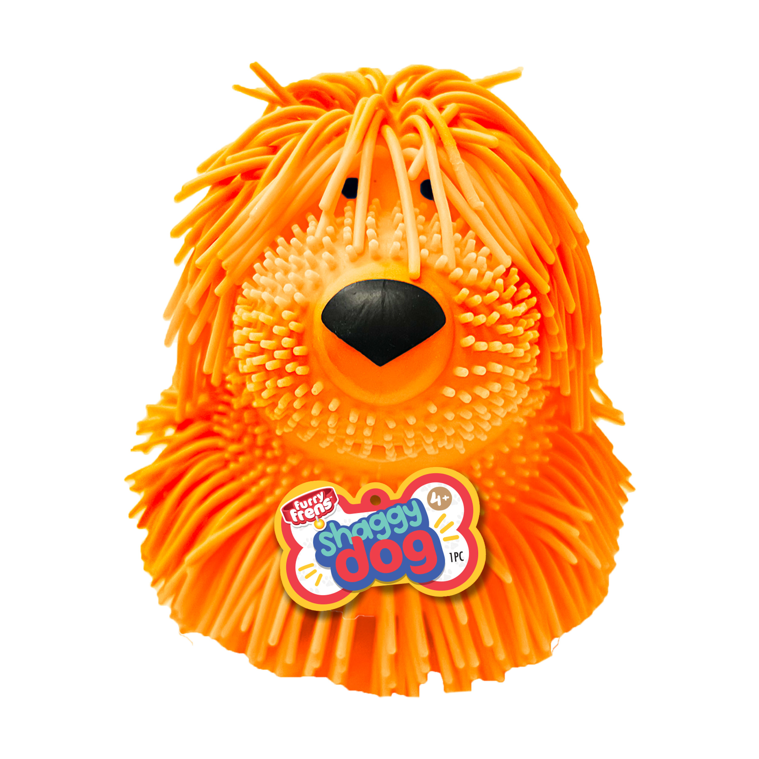 Measuring approximately 7.5 inches long, this giant puffer ball dog boasts a soft rubber spike exterior and an irresistibly super-squeezable texture; Perfect for relieving stress, improving focus, and providing endless entertainment, this toy offers a range of tactile experiences.; Stretch it, squeeze it, fidget with it, or give it a toss the possibilities are as boundless as your imagination.; The Furry Frens Shaggy Dog comes in assorted bright colors, including Orange, Blue, or Pink, ensuring there's a perfect hue for every taste.